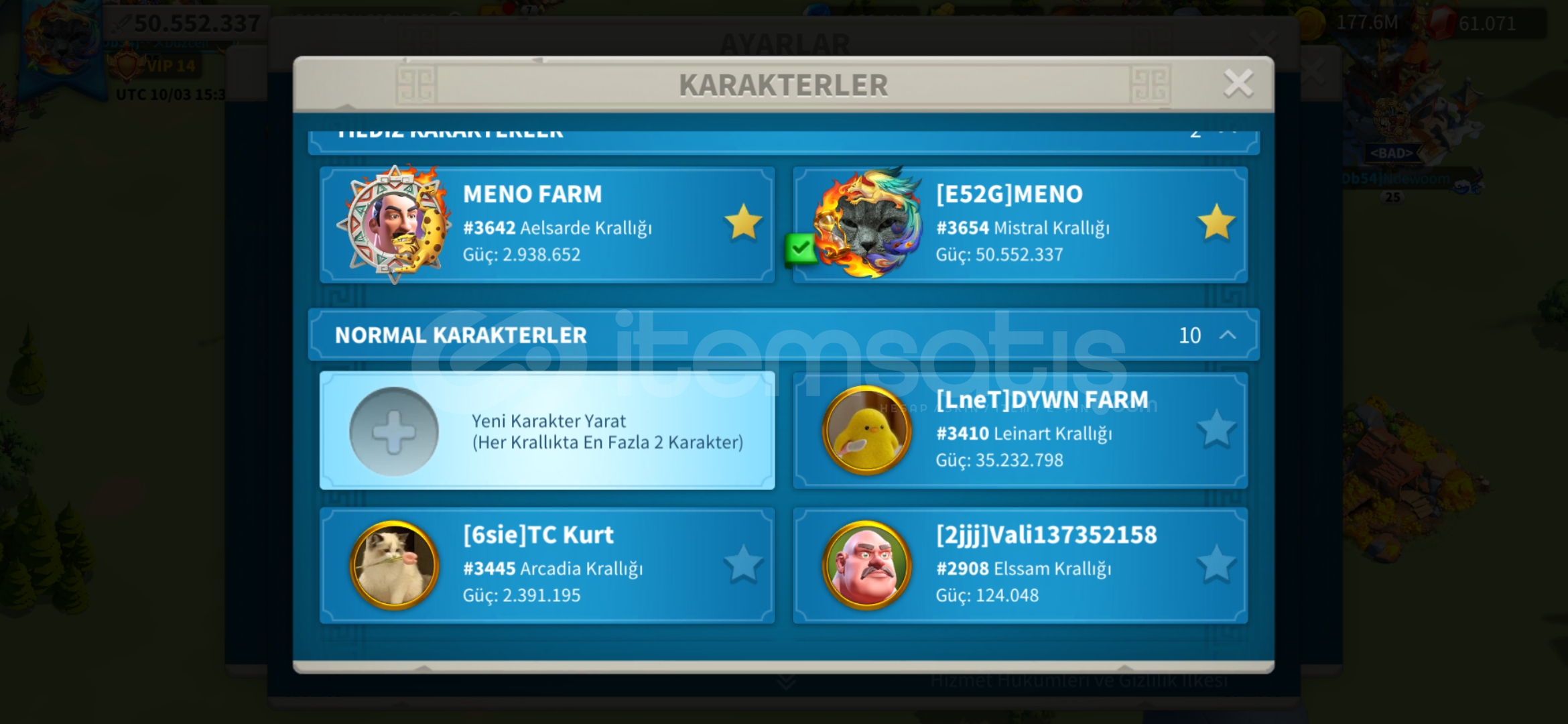Yeni kvk4 içinde 1b kp yapacak rss mevcut kristal tedarik mevcut 42 gun elmas tedarik mevcut 61k elmas mevcut Yeni kralliklara kvk4 tekrarı yapabiliyor bai lui Alex max gorgo yapılıyor 3039 kafa mevcut 2 kita piyade suan 2. Kita seti hazırlanıyor 2 efsanevi ekipman yapacak parça hazır orta derece raporlarda üzmeyecek tadımlık hesap aynı gmailde 3 farm hesabı mevcut birisi 35 m ch25 farm hepsi kvk5 de göç etmeye haz&...