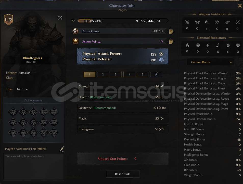 Hesap 34 leveldir.Kıyafetlerin hepsi +5 dir ve +5 dexterity vardır, takılarda ise +7 strength +6 dexterity +5 dexterity +7 intelligence vardır.Herhangi bir klana dahil değildir.Traning Knife lar +6 dır ve Yay +3 dür.Fotoğraflarda gösterildiği gibidir kozmetik vesaire yoktur.Hesap 12 Haziran 2022'de kuruldu.Hesabın ismi BlindLegolas dır ve hesapta mağazadan alınmayan iksirler petler xp boostlar vardır.Hesapta şuan 311...