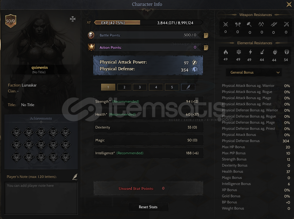 Hesap 50 leveldir.Kıyafetlerde eldiven ve ayakkabılar +5 dir ve takılarda ise +6 strength +6 +5 +3 health vardır.Herhangi bir klana dahil değildir.Frozen Circle silahını kullanır +6 dır kalkan ise +1 dir.Fotoğraflarda gösterildiği gibidir kozmetik vesaire yoktur.Hesap 2 Haziran 2022'de kuruldu.Hesabın ismi quiewein dir ve hesapta mağazadan alınmayan iksirler petler vardır.Hesapta şuan 28k para vardır.Hesapt...