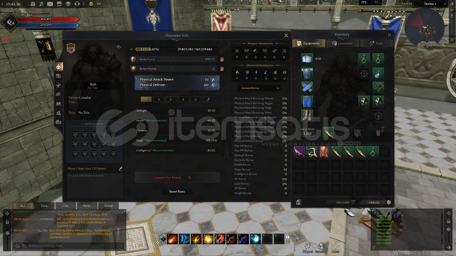 Hesap 60 leveldir.Kıyafetlerin hepsi +7 +9 magic vardır ve takılarda ise hepsinde +8 magic vardır.Herhangi bir klana dahil değildir.Wooden Rod silahını kullanır +8 dır lightnin, ice, fire(2) vardır.Branch fire +8, Facelifter +1, Kryss +1(3), nercomencer lar hepsi +1, XP Boost (4), Golden Bow +1, Mega Potionlar (1klık), Unique Upgrade Scrool(2).Hesaptaki istediğiniz her şeyi satabilirsiniz.Fotoğraflarda gösterildiği g...