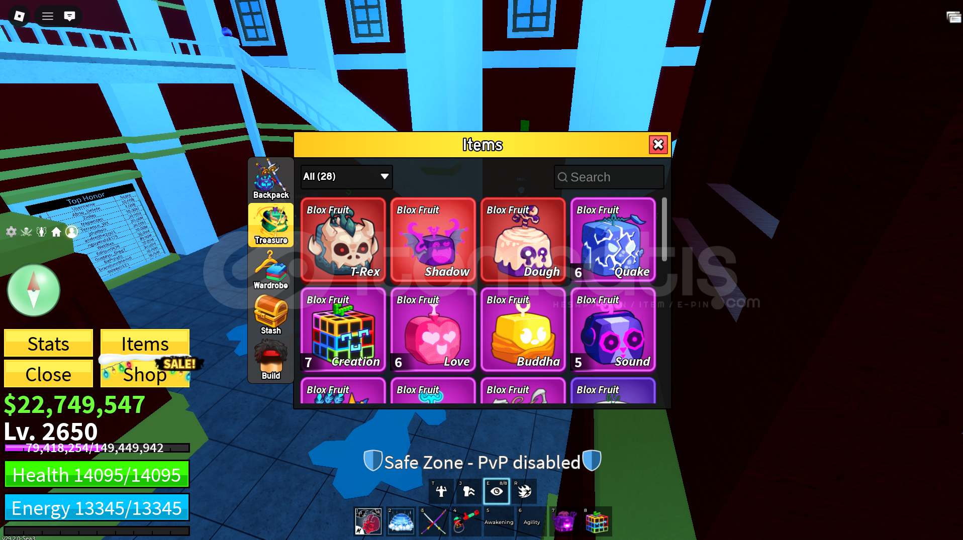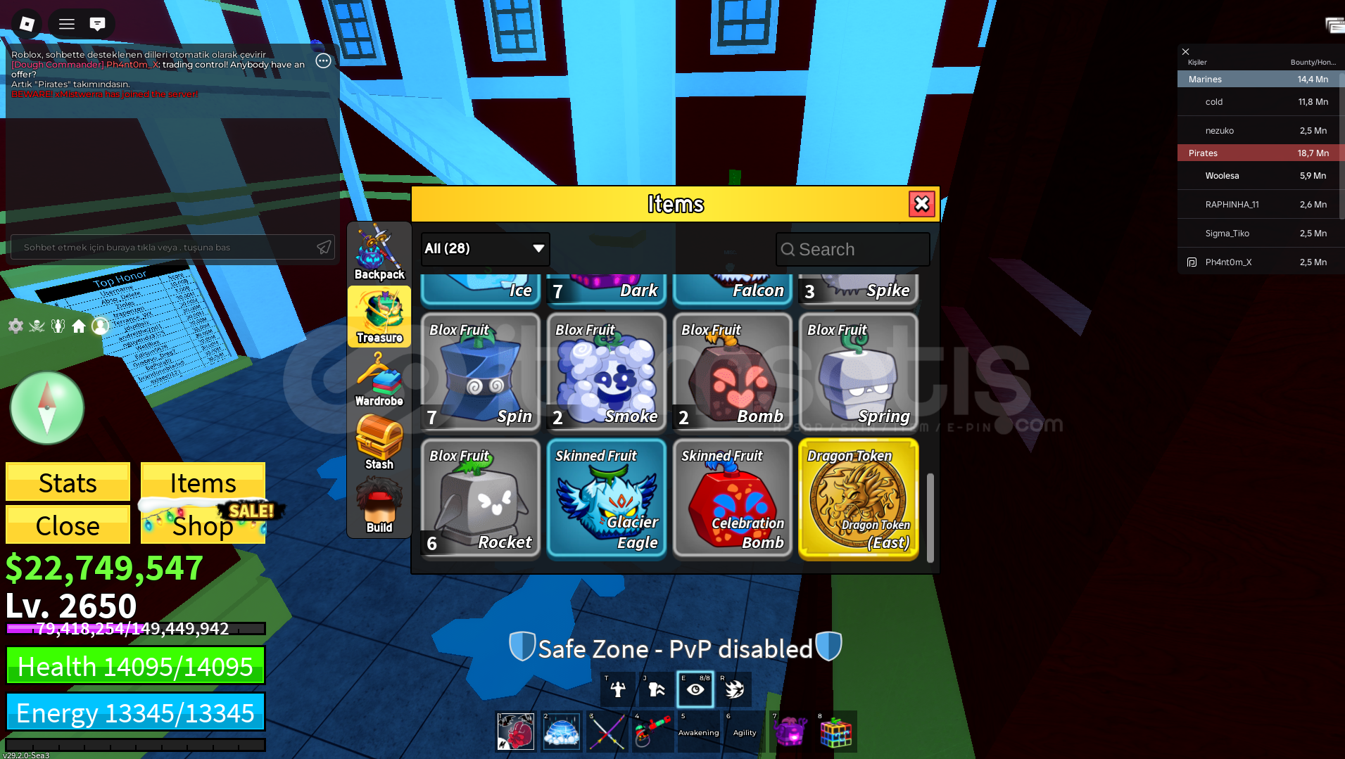 görsellere sığdıramadığım şeyleri aşağıda sıraladımperma fruitler: Dragon-east Control Tiger Dark Rumble Phoenix Portal İce Light Quake Buddha Gravity Venom Doughgamepassler: 2x mastery 2x money 2x boss luck fast boat dark blade 7x fruit kapasitesibayadır oynamıyorum o yüzden satmaya karar verdim bu kadar permaya nazaran fiyatı gerçekten pazarlık yoktur haze piece bee swarm gibi oyunlardada ger&...