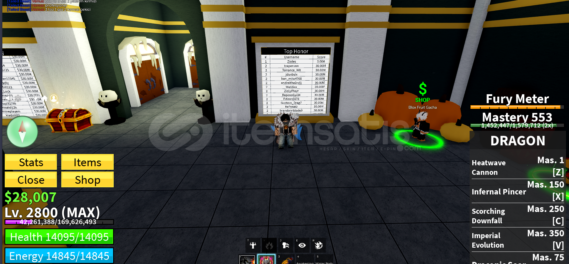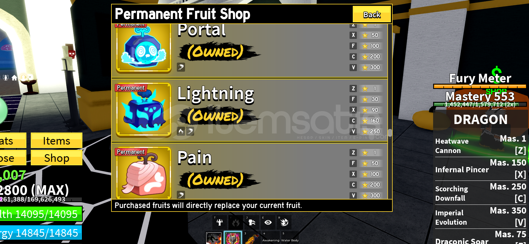Perm olarak içerisinde;DragonYetiTiger (+Werewolf)GasPain (+Super spirit pain)LightningPortalBuddhaBladeMeyve olarak ( Max cap 5)2 Purple Lightning1 Yellow Lightning3 Tiger4 ControlTrex,pain gibi mitic ve efsanevi meyveler bulunmakta.GamepassBütün gamepasslar mevcuttur (Fruit Notifier hariç)Hesabın durumu;2800 Level (max)Perm bütün meyveler v2 ve 300 mastery üstüdür.Hesabın içerisinde *Dark Blade* Vardır.Bütün d&oum...