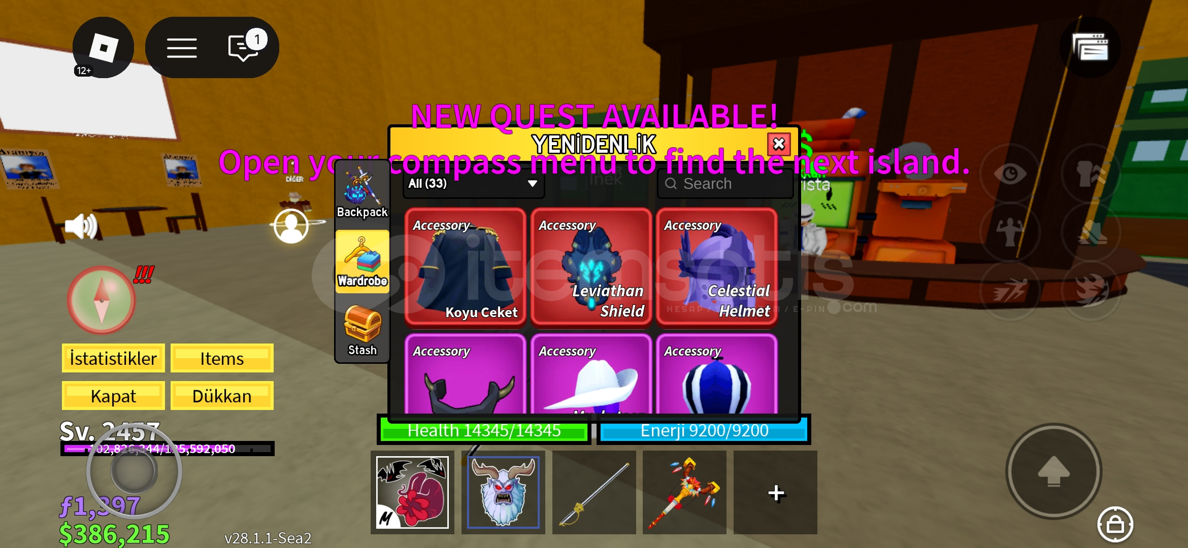 2400 lvl ve üstü içinde prem dragon yeti portal var.shark ancher ve spiken trindent shark ve angle v3 dark coat ve levi kalkanı da vardır satın almadan önce iletişime geçiniz hesapdan elimizde 1 tane varır e-posta telefon numarası size ait 7/24 hesapla.alakalı destek en ucuz prem li hesap