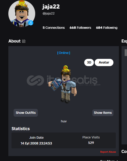 Hesabın emaili onaylanmamıştır, onay şapkası yoktur geri çekilme ihtimali yoktur ilk mail siz olacaksınız.Hesapta 20+ Offsale vardır.Toplam 13000 robux değerinde limitedlar vardır satıp robuxa çevirebilirsiniz.Hesap 2008 kurulumdur.İndirim pazarlık mevcut yazabilirsiniz.Hesap ismi jaja22Hesapta artık alınamayan Inviter, Bloxxer, Warrior, Combat badge vardır.