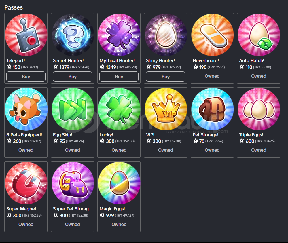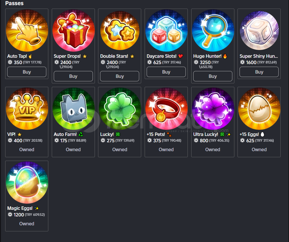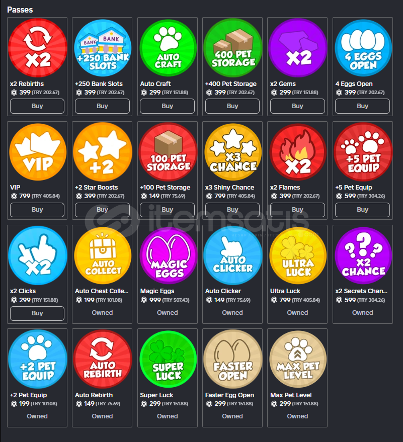 • Hesapta Pet Simulator 99, Pet Simulator X, Rebirth Champions X ve PETS GO gibi kasılmalık oyunlar oynanmış ve bu oyunlardan bazılarına GamePass alınmıştır. Onun dışında Avatara bir harcama yapıldığını görmedim, yapılmamıştır. Sadece Robux harcamaları Oyun GamePasslerine yapılmıştır.