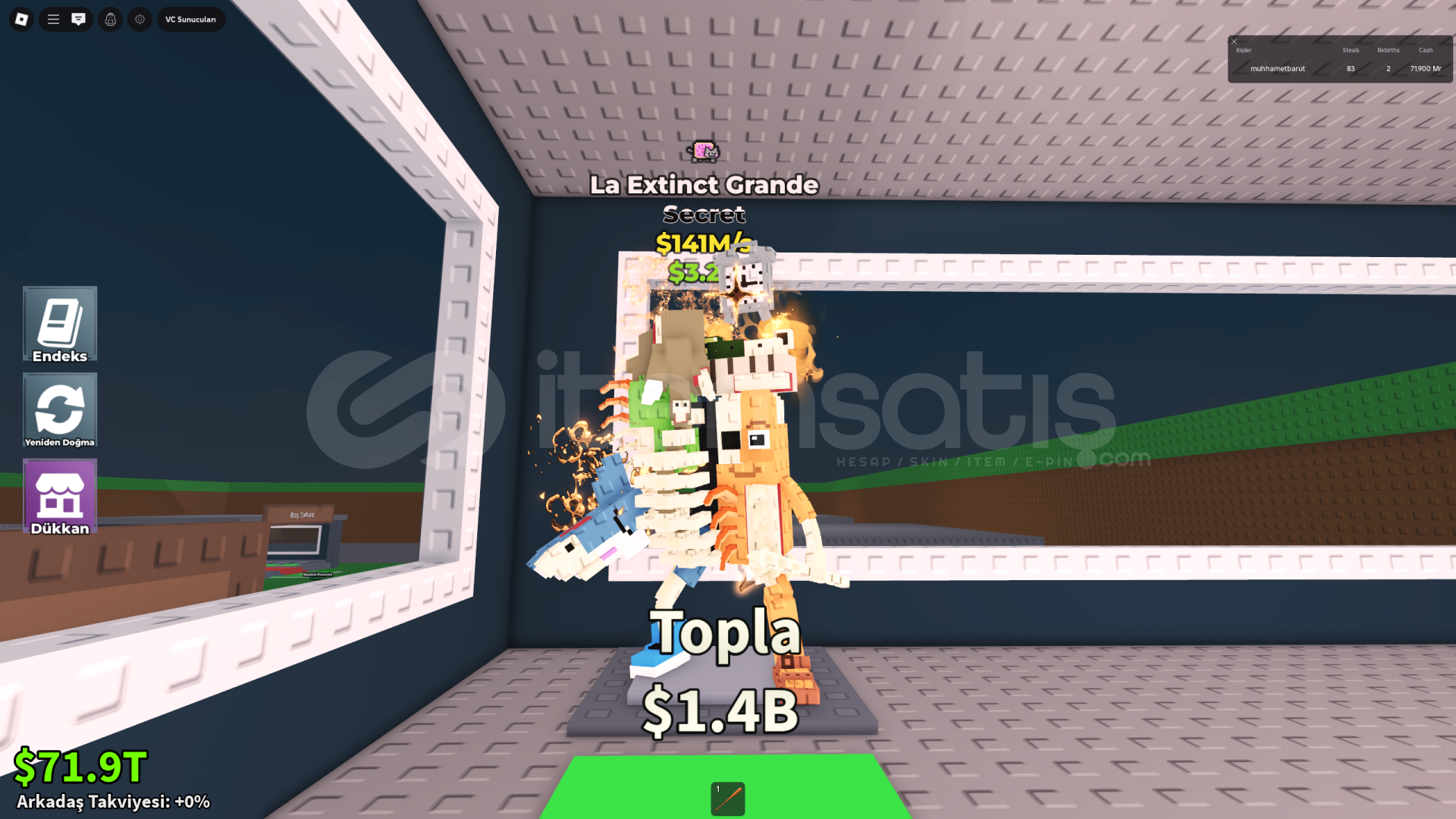 ÜRÜN HAKKINDA GENEL DETAYLAR ;Satın Aldıktan Sonra Bana Kullanıcı Adınızı Yazmanız Yeterlidir.Oyun içinden 1 adet La Extint Grande verilecektir.Toplu alım için dm üzerinden ulaşabilirsiniz.Private Serverda teslim edilir.Oyunda bulunan en nadir secretlerden biridir.Satın aldıktan sonra kayıt açmayı unutmayınız.