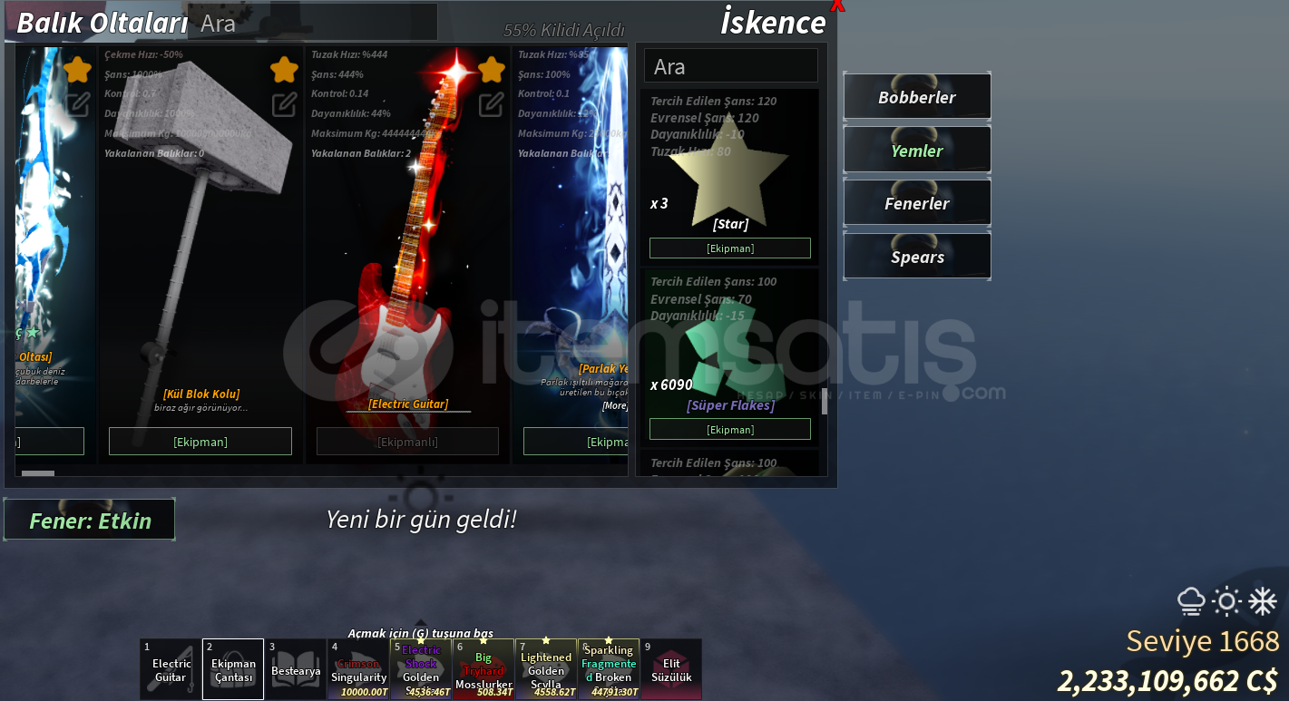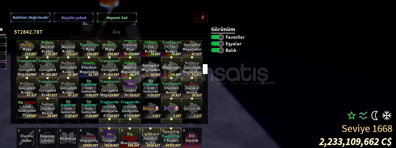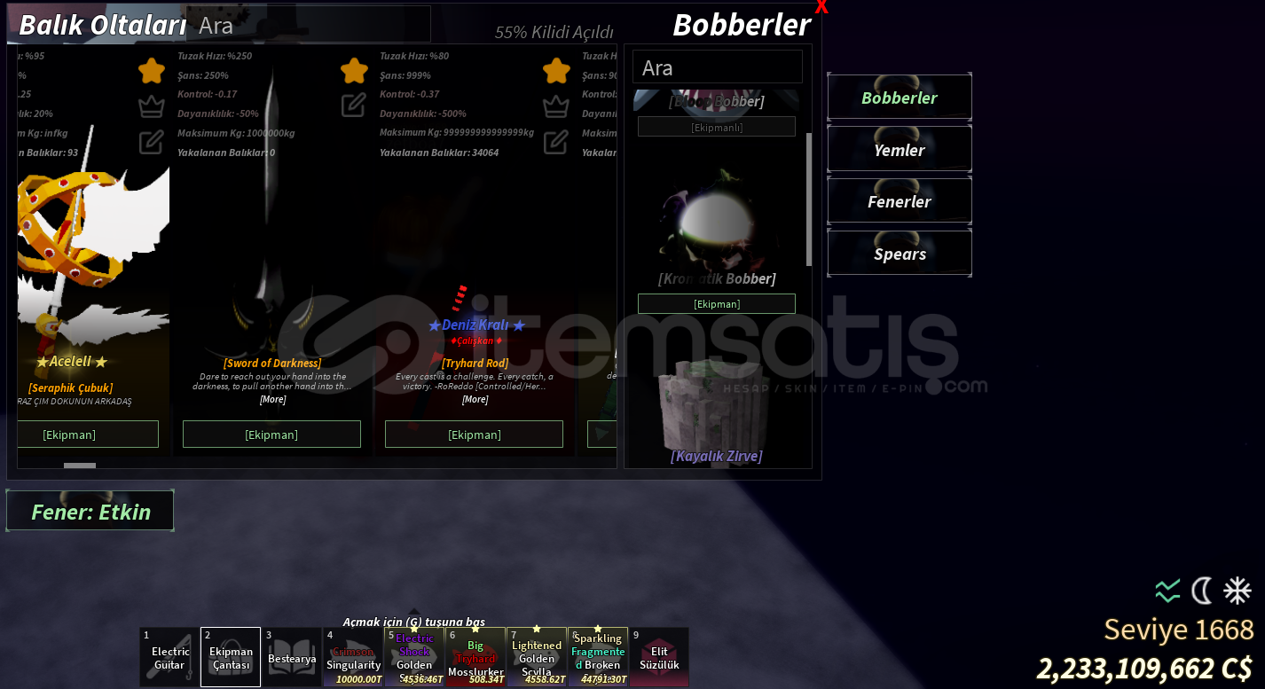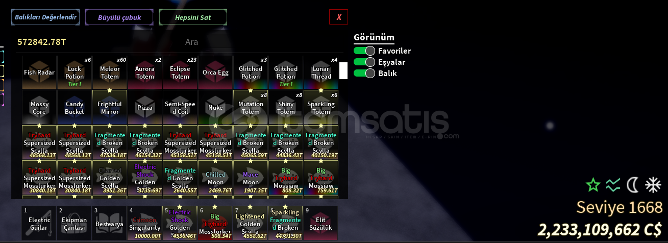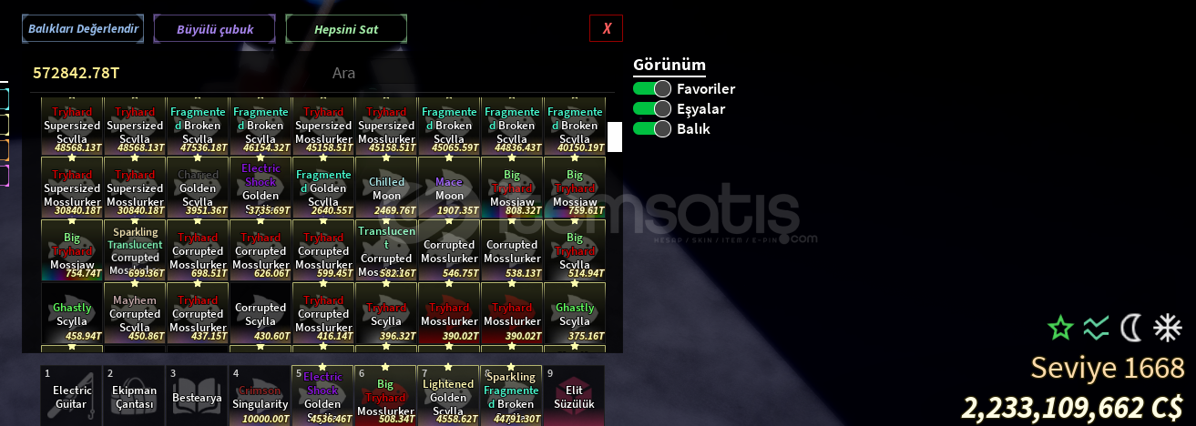 OYUNUN EN İYİ HESAPLARINDAN BİRİDİR.Hesabım Şuanda 1668 leveldir. 2 Milyar!! Coin Vardır.Try Hard Rod, Electric Guitar Rod , Serpahic Rod, orjinal No Life Rod , Cerculean Fang Rod, Vampiric Fang Rod , Great Rod Of Oscar , Great Rod Of Dream , Rod Of the Depths , Kraken Rod , Zeus Rod , The Boom Ball , Trident Rod , Tempest Rod , Scarlet Spincaster Rod , Luminescent Oath Rod Ve Bir Çok Rod Oyundaki Rodların %55 ü Açılmı#...