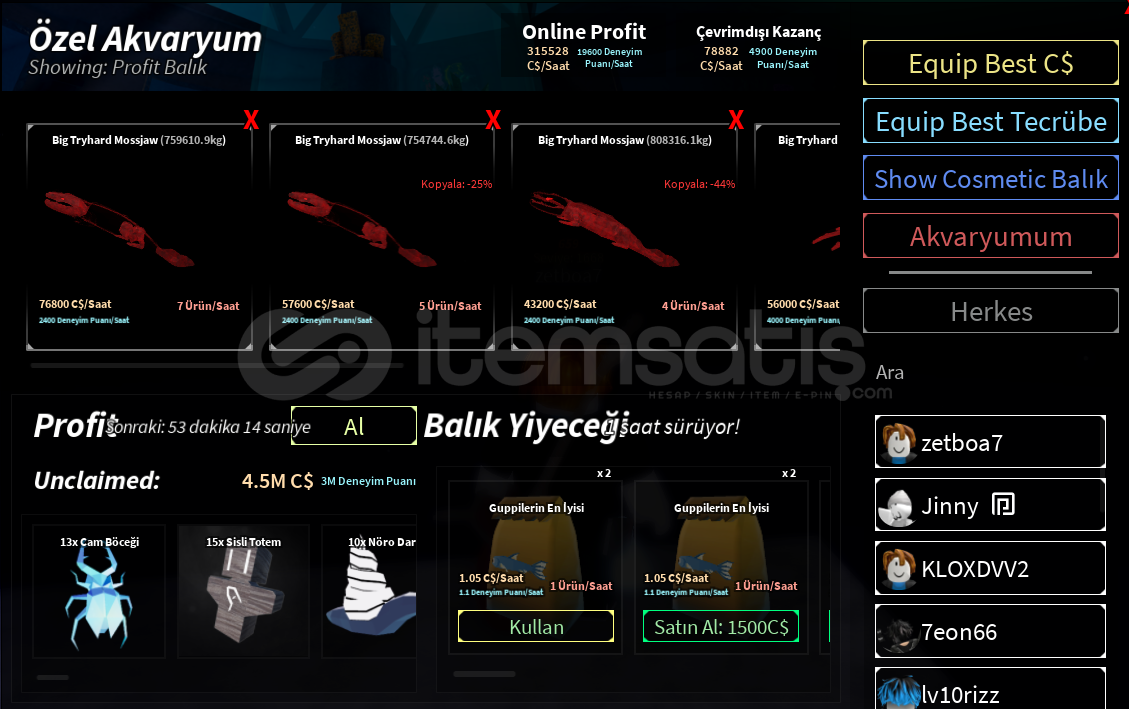 Hesapta Saatlik 315k Coin Veren Akvaryum Balıkları Mevcuttur. Kolayca Afk Kalarak Coin Kasabilirsiniz.