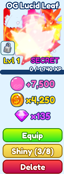 🥚Peti teslim alabilmeniz için oyun içi 2000 yumurta açmış olmanız gerekmekte.💎 1 Adet Secret OG Lucid Leaf verilir📖Pet verilmeden önce Secret Hunter (pet takılıyken açılan 1.5m eggde %5 secret boost bulunur) enchantı basılır. (İstek üzerine, istediğiniz enchant da basılır)📖Daha öncesinde Secret Hunter çıkarmadıysanız Pet Enchanter b&oum...