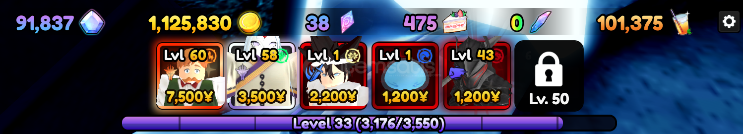 Hesapta Monarch Kaguya ve Monarch Escanor bulunuyor ekstra unit olarak slime jin mori ve evo guts bulunmakta