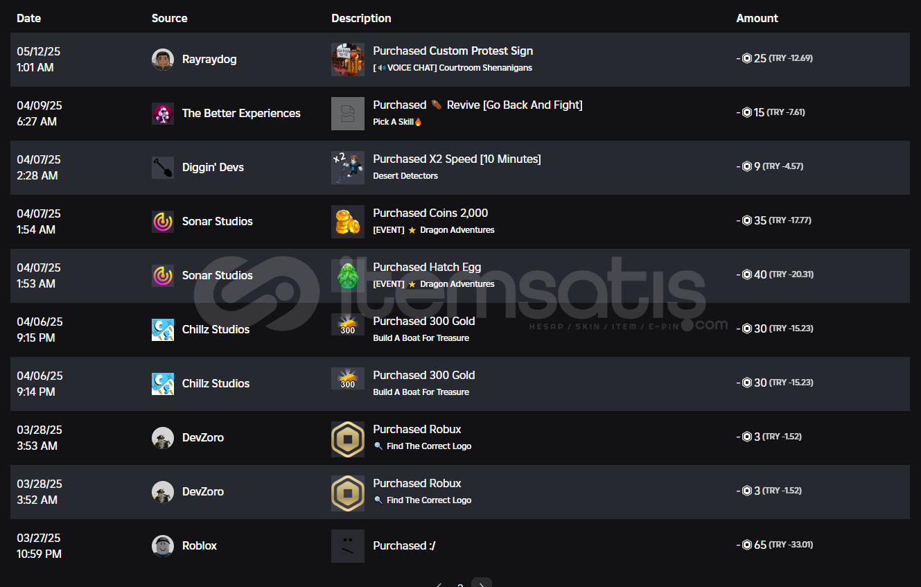 • Hesapta Build A Boat For Treasure, BrookHaven, Fisch, Dead Rails, Dragon Adventures, Desert Detectors, Daycare 2 (Story), Morph World! [INDOMINUS REX] ve Blox Fruit gibi oyunlar oynanmış olup birkaçına GamePass & Harcama yapılmıştır.