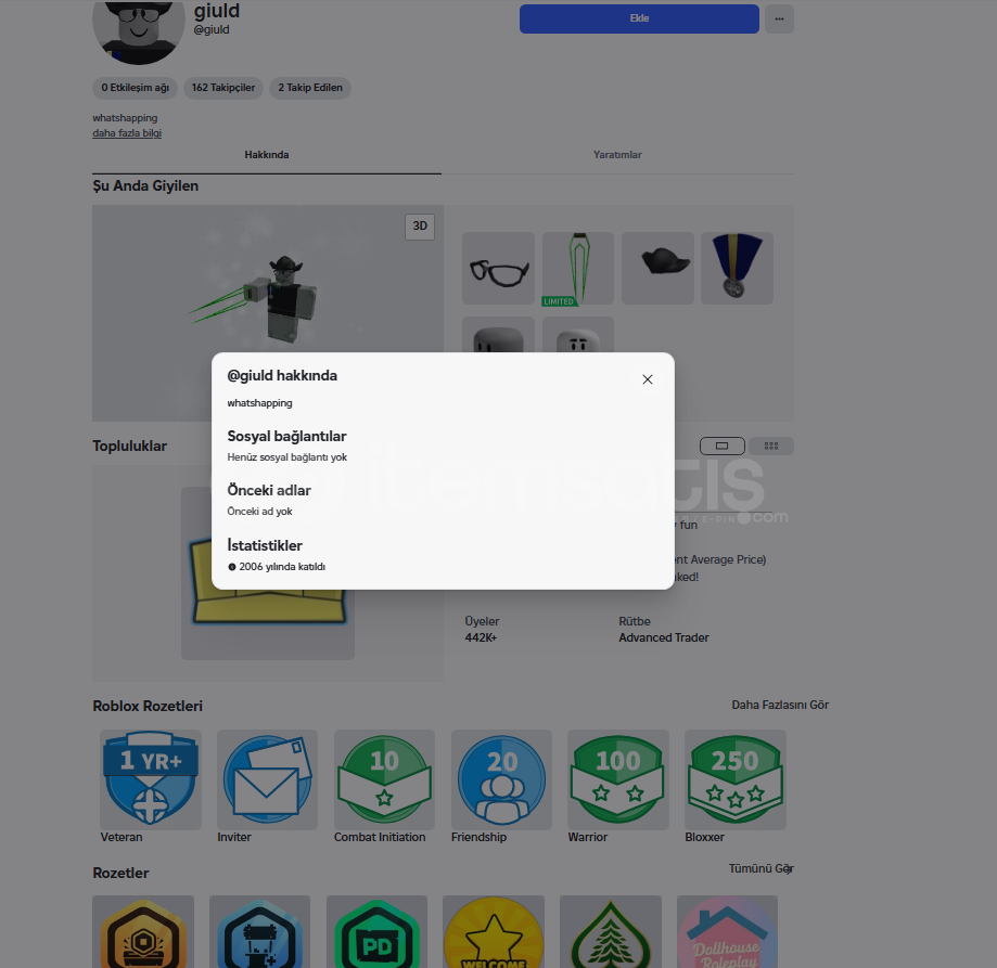 https://www.roblox.com/users/2648/profilehttps://www.roblox.com/users/2648/inventory/User Name: giuldCountry: NetherlandsRegister date: Aug 30, 2006Auto renewal subscription: NoSocial accounts: NoRobux: 12Verified: NoAge verified: NoEmail is verified: NoCredit balance: ₺0Inventory value ~ 5,521 RobuxLimited items RAP ~ 5,083 RobuxRAP UGC: 0 RobuxGamepasses: 0 RobuxOffsale items: 28Transaction stats;Total robux: 2145