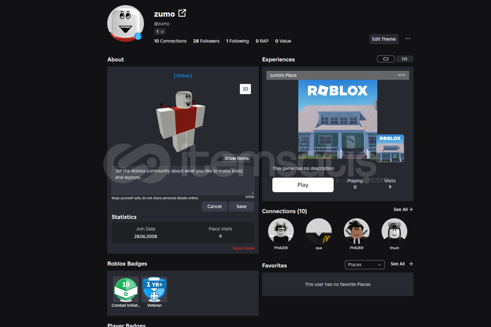 •Hesap ismi: zumo•Hesap profili linki: https://www.roblox.com/users/579057/profile•Hesap açılım tarihi: 28.06.2008•Hesapta Combat Initiation Badge vardır 2015ten sonra roblox vermemeye başladı hesaba bu da oldukça değer katar.•Hesapta 60 dolar değerinde toy codeler vardır: Crescendo Sword Pack ve Silent Swordpack•Hesapta tüm event eşyaları vardır bunu kendi emeklerimle yaptım event yapman...