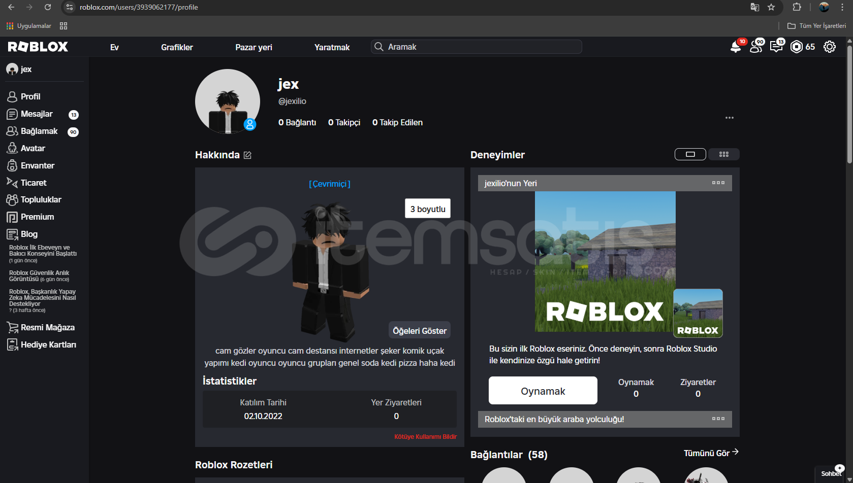 Hesap 2022'de kurulmuştur kendi ana hesabım. avatar için 1250 robux harcanmıştır toplam gamepassler için 2500 robux harcanmıştır. 65 robux var hesapta. ciddi alıcılar yazsın pazarlık yapılır. 500 robux'luk toy animation seti vardır.