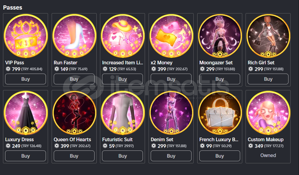 • Hesapta Adopt Me, Dress To Impress, Welcome To BloxBurg, Tower Of Hell ve Berry Avenue RP gibi oyunlar oynamış, bazılarına ise GamePass almıştır. Diğer Robux harcamaları ise Avatarlara gitmiştir.