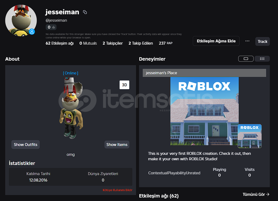 ROBLOX HESAPÜrün tamamen otamatik teslimattır. Stok sormanıza gerek yoktur.İLAN HAKKINDA BİLGİLERHesaba tüm bilgilerinizi ekleyebilirsiniz.Herhangi bir problem yaşanmaması için satın alırken video kaydı almanız gerekmektedir.RAP değerleri değişken olduğu için ortalama 235+ RAP olarak belirttim. (RAP hesaptaki limitedleri...