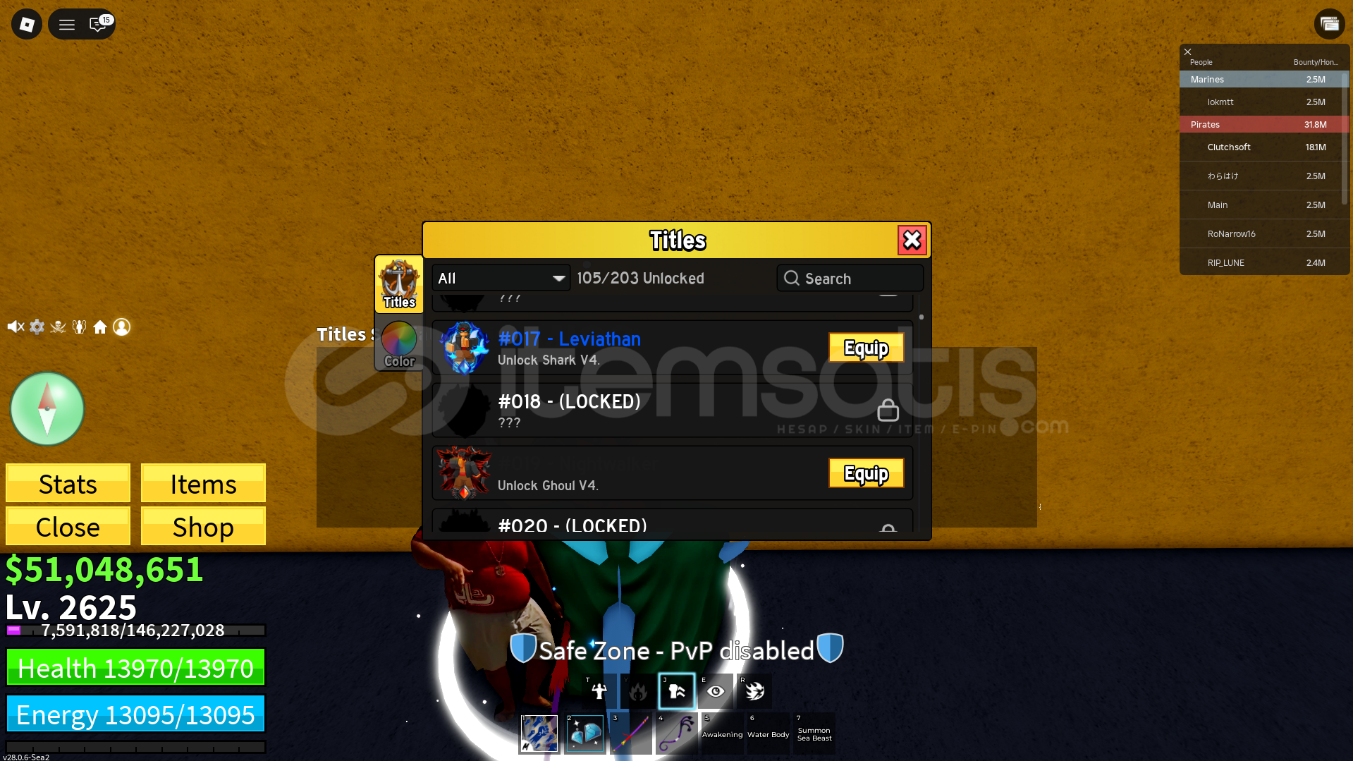 HESAP 2625 LVLDIR   Bounty Olarak Yüksek Fakat Kılıçları Toplamanız lazımROBUX YATIRILMIŞTIR BAŞKA OYUNLARDA DA BİŞEYLER VARPERM; Venom, Trex 2x Money 2x Mastery Fast Boats 2x STORAGE51M BELİ VE 79K FRAGMENT VARDIR.HAKİ V2 YAPILMIŞTIR.V4 FULL GEARPİRATE 18.1M MARİNE 2.5M BOUNTY.
