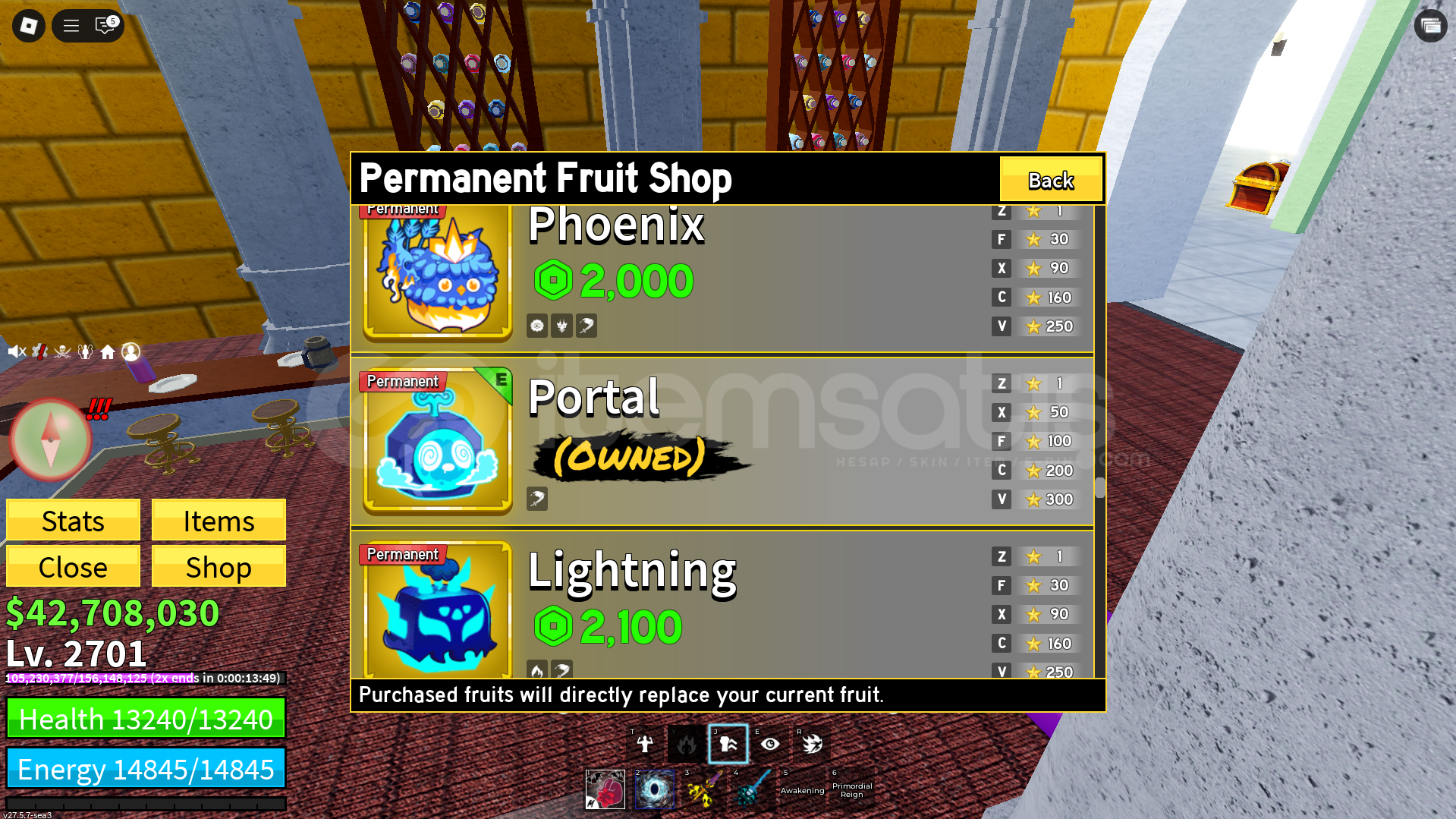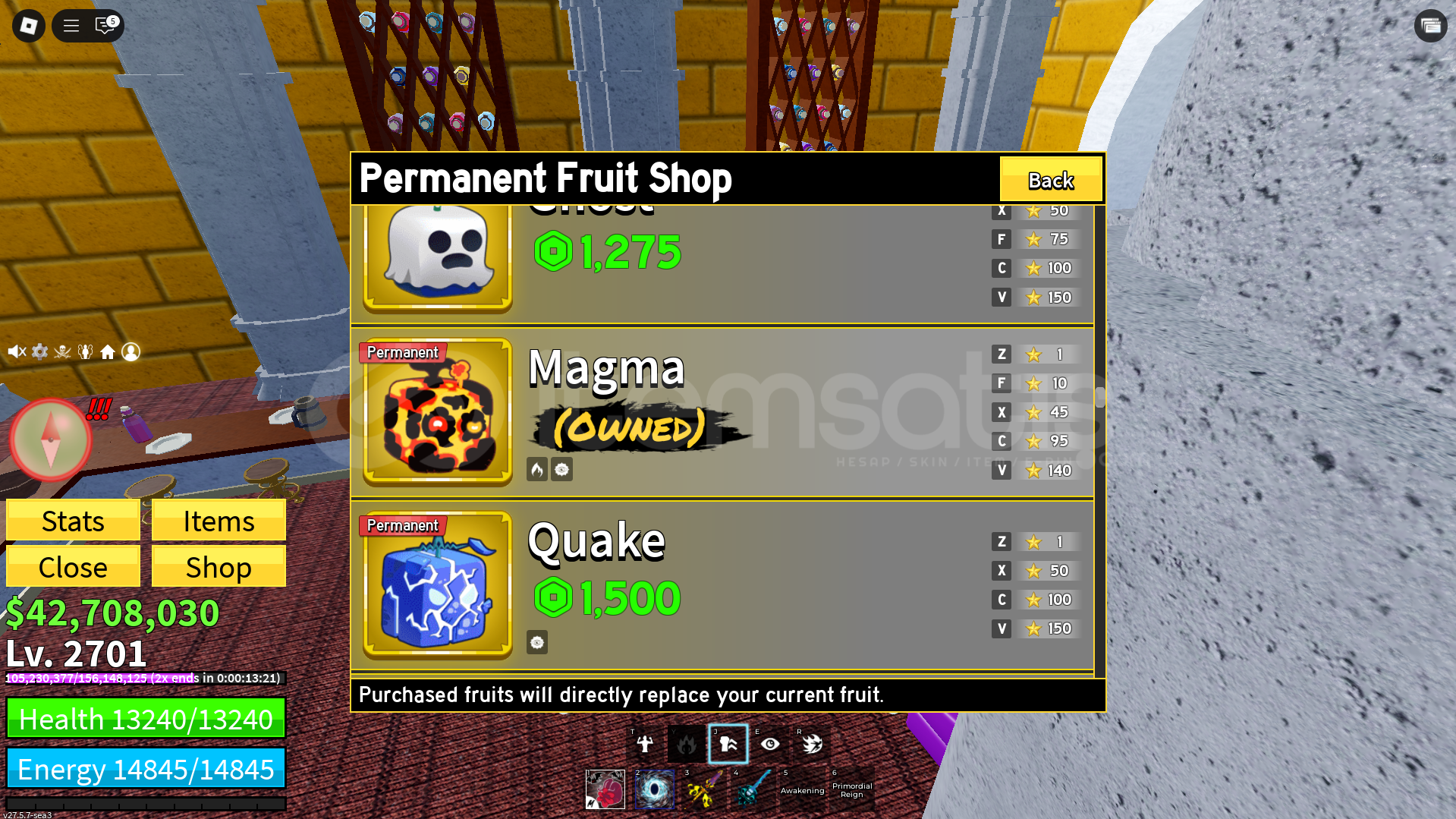 İlanıma Hoşgeldiniz2700 LVL 9 Perm Mevcut42M Beli 6K FragmentDraco V4 FULL GEARPermler: Dragon, Yeti, Gas, Dough, Portal, Buddha, Magma, Diamond, FlameBütün Gamepasslar:2x Money, 2x Mastery, 2x Bossdrop, Fast BoatBütün Dövüş Stilleri Mevcut3 Adet Mytichal SwordPirate:3m Marine: 2.5M BountyHesabın Tam İçeriğine Görsellerden ErişebilirsinizHesabı Satın Almadan Önce Video Kaydı Zorunludur Aksi Takt...
