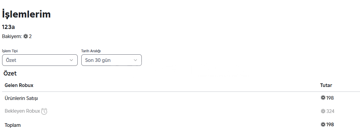 Hesaba 2-3 gün içerisinde 324 robux gelecektir görsellerden bakabilirsiniz.Hesap adı:burakdmr3104Voice chat: YokRobux: 324Hesabın içinde half head (fake headless) vardır.Hesapta robuxlu kıyafetler vardır.Hesabın envanterindekilere toplam 200 robux harcanmıştır.Hesabın maili sizin üzerinize yapılacaktır. (Değiştirilecek)