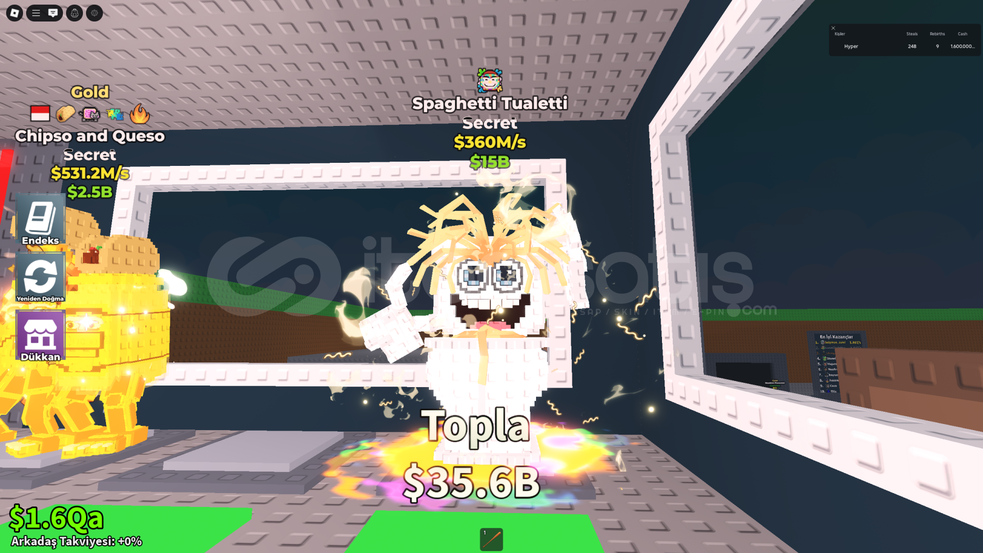 ÜRÜN HAKKINDA GENEL DETAYLAR ;Satın Aldıktan Sonra Bana Kullanıcı Adınızı Yazmanız Yeterlidir.Oyun içinden 1 adet Spaghetti Tualetti verilecektir.Toplu alım için dm üzerinden ulaşabilirsiniz.Private Serverda teslim edilir.Oyunda bulunan en nadir secretlerden biridir.Satın aldıktan sonra kayıt açmayı unutmayınız.