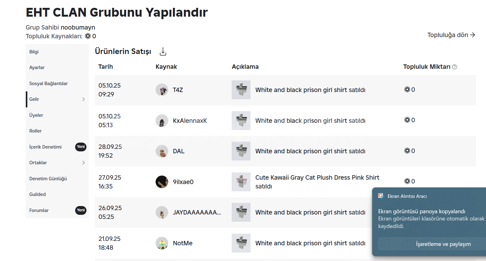 2.5K Robuxada Verilir Grub Devredilecektir13 Shirt Vardır En Çok Satılan 141 Adet SatılmıştırAktif Olarak Hala Kıyafetler Satılmaktadır.