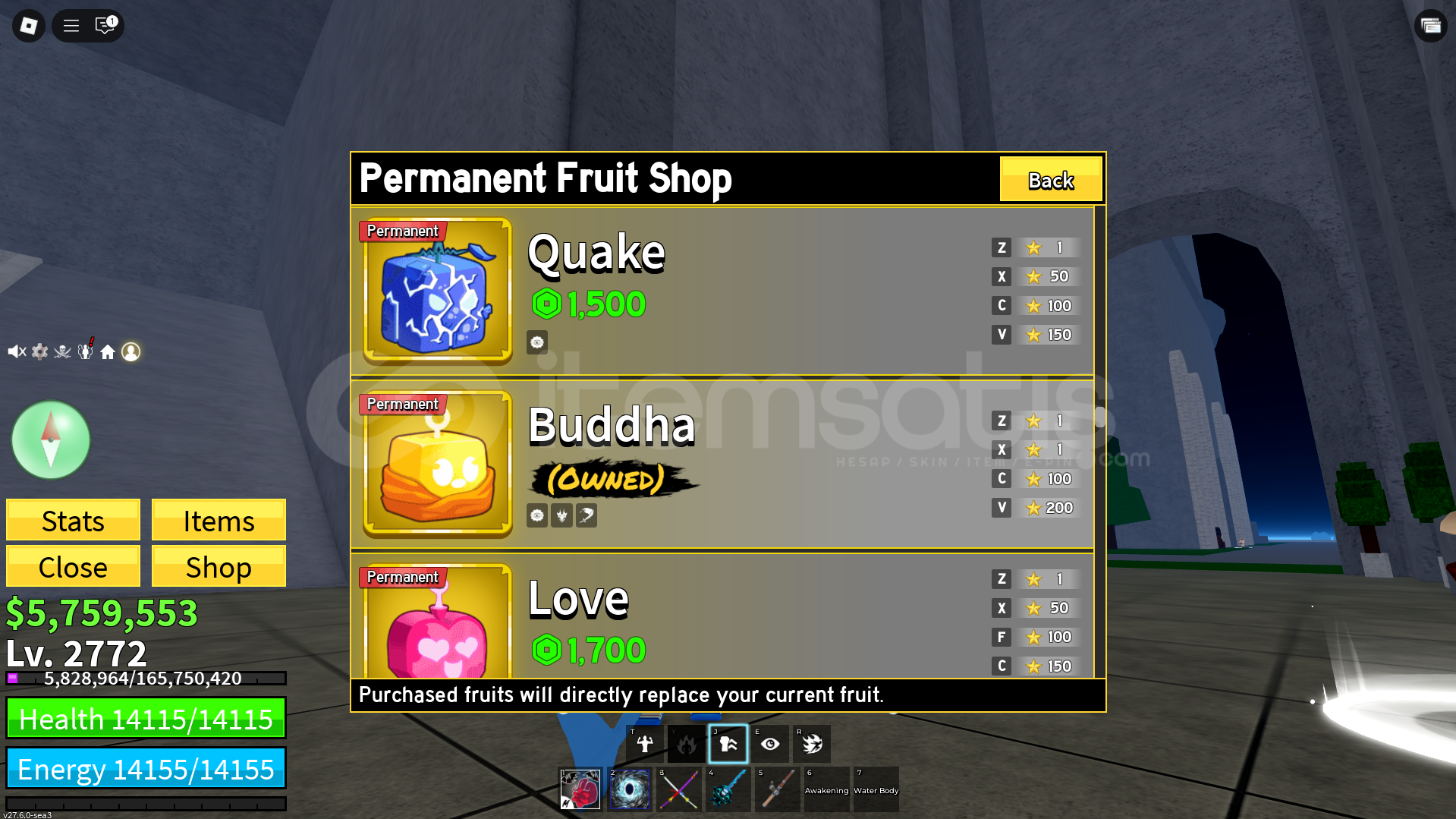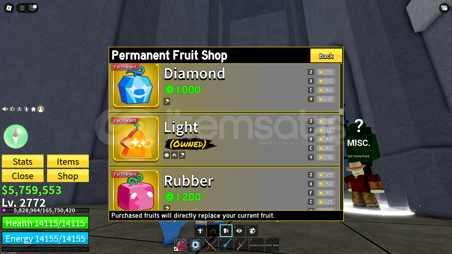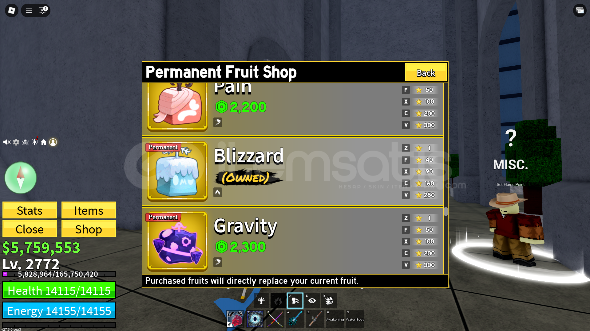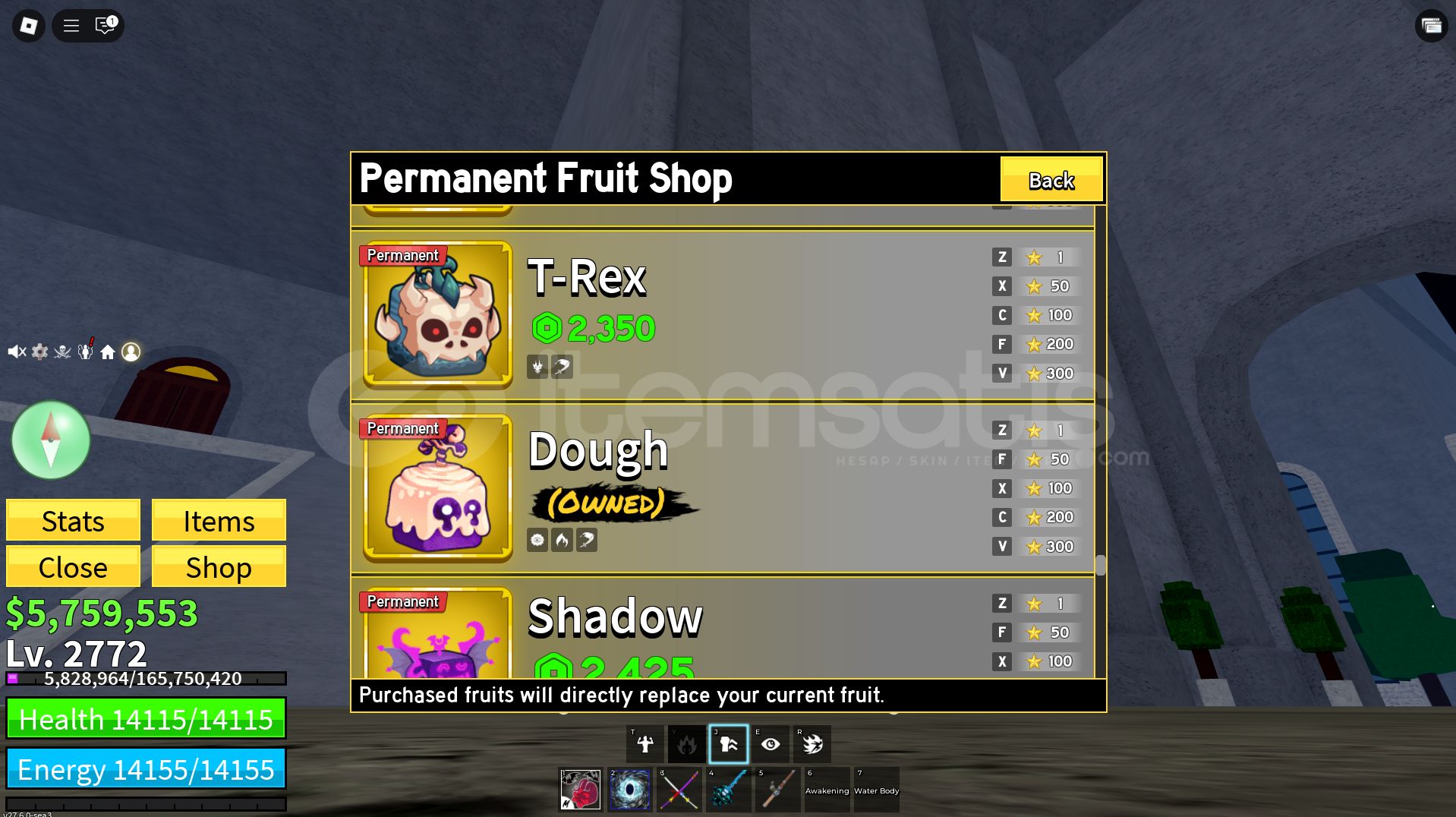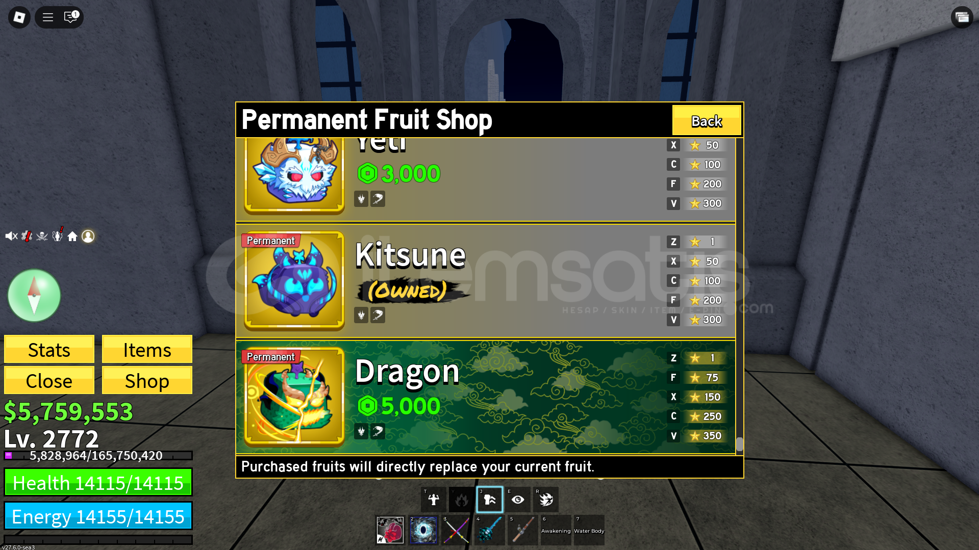 HESAP 2772 LVLDIR CDK , DARK BLADE , VE SKULLGUİTAR BULUNMAKTADIR.ROBUX YATIRILMIŞTIR BAŞKA OYUNLARDA DA BİŞEYLER VAR Avatarlar FazlaPERM Kitsune, Venom , Dough , Blizzard , Portal , Lightning , Buddha , Light , Rocket2x Money 2x Mastery 2x Boss Drop Fast Boats 8x STORAGE Fruit Notifier5M BELİ VE 32K FRAGMENT VARDIR.HAKİ V2 YAPILMIŞTIR.V4 FULL GEAR SHARKPİRATE 5M MARİNE 2.5M BOUNTY.BÜTÜN...