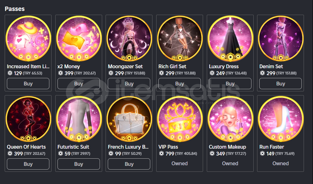 • Hesapta Dress To Impress, Horse Valley, Adopt Me ve Laundry Simulator gibi oyunlar oynanmış, sadece Dress To Impress'e GamePass alınmıştır. Diğer Robux harcamaları ise Avatara yapılmıştır.