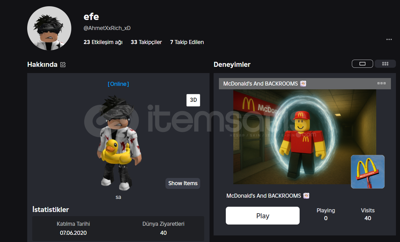 NİCK;AhmetXxRich_xD Hesap Benim Main Hesabım Olup Gmaili Herşeyi DeğişenHesaptakı Avatar Öğelerini Gidip Bakın buraya yazmak Çok Uzun Sürdüğü İçin YazamadımHesapta MM2 Game Pass Bulunmaktadır Hesabı Satın Alırsanız 2 Adet Kıyafetli Grup Hediye Verilecektir Bu Linkten Tıklayıp Hesabı İnceleyebilirsiniz https://www.roblox.com/tr/users/1680494634/profilepazarl&...