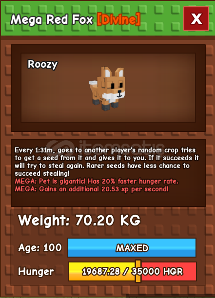 70KG MEGA RED FOX Satışıdır. Grow a Garden(GAG) oyunudur.