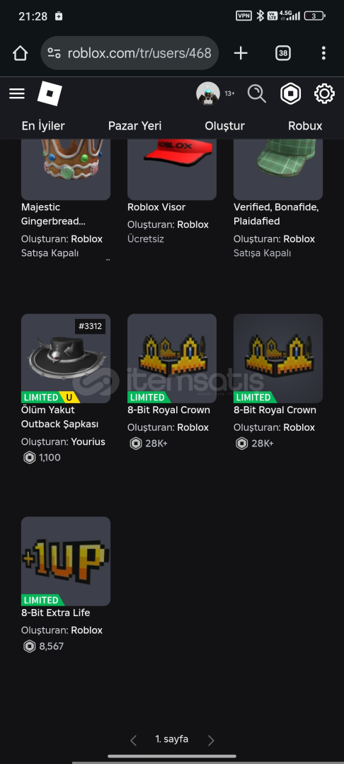 8-Bit Royal Crown adlı İtem satılmaktadır. 👾Pazarlık vardır.🌟Trade yapabilmek için 1 tane ucuz fiyatlı limited eşyanızın ve Roblox Premium Aboneliği izin olması gerekmektedir. 🤝( Arkadaşlar lütfen bana neden 1 yıldız vermiş adamı dolandirdinmi gibi sorular sormayın İşte çalışıyordum hesabı teslim yapmadım 3-4 saat buyuzden dolay&#...