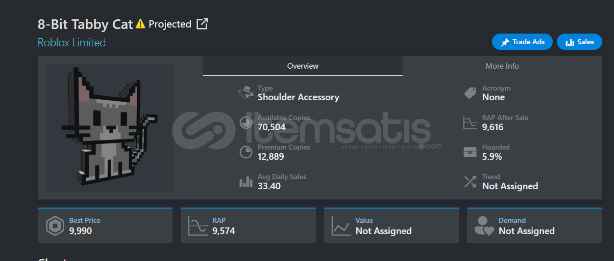 İlanı Aldığınızda 8 bit tabby cat Limited Trade Yöntemi İle Teslim EdilirRolimons Sitesine Göre Value Değeri yaklaşık 10000 Robuxtur ve Demandı(Talebi) Low SeviyesindedirSize Teslimi Gerçekleştirebilmem İçin Hesabınızda Premium Ve Bir Adet Small Limited(UGC Olmayan 0-200 Robux Arası Herhangi Bir Limited) Bulunmalıdırhttps://www.rolimons.com/item/10159617728FİYATI AŞIRI UCUZ...