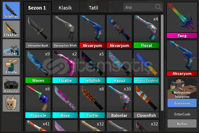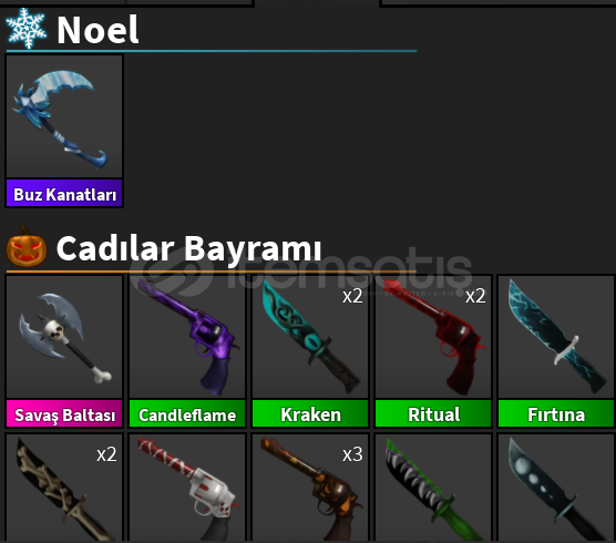 Murder Mystery 2 de Vampir radyo ve Chroma Fang - Icewing Aquarium seti(silah ve kılıç) ve BattleAxe bulunmaktadır. Bu itemlerden almak istediğiniz varsa direkt teklifinizi ileterek yazın aksi takdirde dönüş sağlanmaz.