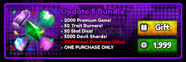All Star Tower Defense X de Update 5 Bundle Giftlencektir.Oyun içi verilecektir.Level farketmiyor.-----------------------------2000 Premium Gems50 Trait Burner50 Stat Dice ve5000 Devil Shards verilecektir.