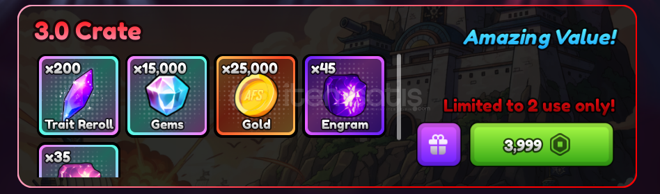 Anime Final Strike da 3.0 Crate verilecektir.----Paketin içinde:200 Trait Reroll15,000 Gems25,000 Coins45 Engram ve35 Perfect Engram vardır.----Level farketmiyor.