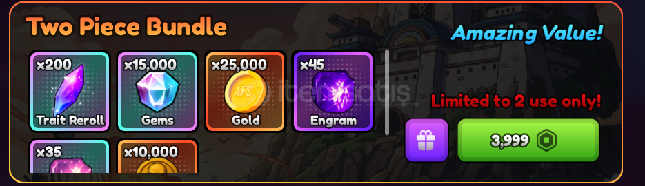 Anime Final Strike da Two Piece verilecektir.----Paketin içinde:200 Trait Reroll15,000 Gems25,000 Gold45 Engram35 Perfect Engram ve10,000 Pirate Coins vardır.----Level farketmiyor.