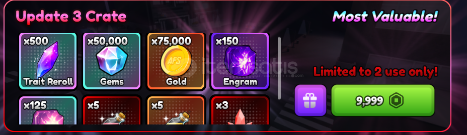 Anime Final Strike da Update 3 Crate verilecektir.----Paketin içinde:500 Trait Reroll50,000 Gems75,000 Coins150 Engram125 Perfect Engram5 Super Lucky Potion3 Fragment (Secret) ve5 Lucky Potion vardır.----Level farketmiyor.