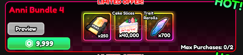 Anime Vanguards da Anni Bundle 4 verilecektir.----Paketin içinde:700 Trait Reroll10,000 Cake Slice ve250 Stat Chip vardır.----Level farketmiyor.