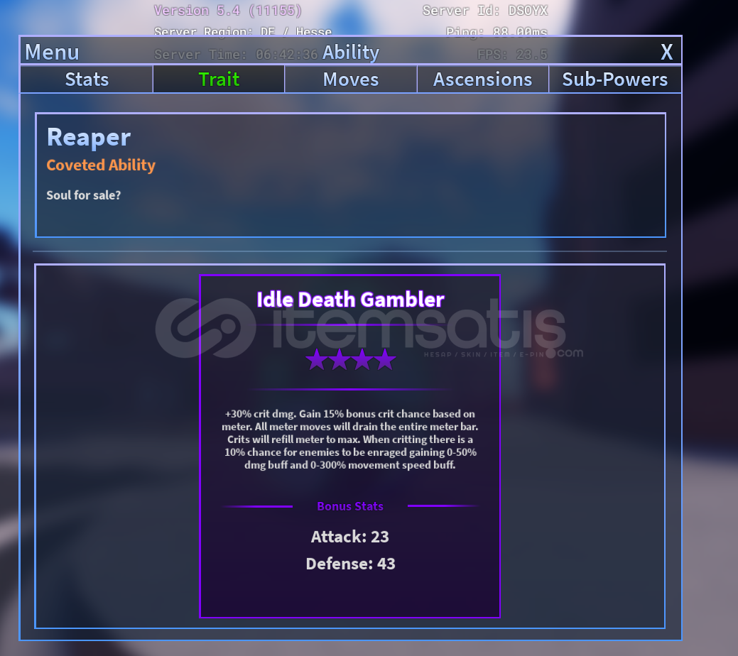 AUT- Reaper [ Idle Gambler ] Kaçırmaaa! Idle Gambler Traite sahip Standlar Oyun içinde Güçlü veren en iyi legendery trait olmaktadır Bütün Skiller Crtic Hasar artışı ve Critik olma şansı ve Dehset Hasar Tek atarsın Pvp deDeğerinin altına satışÖzellikle Overflowing Trait sahipleri Oyun içinde Skill kullanımda daha az harcama gibi birs&u...