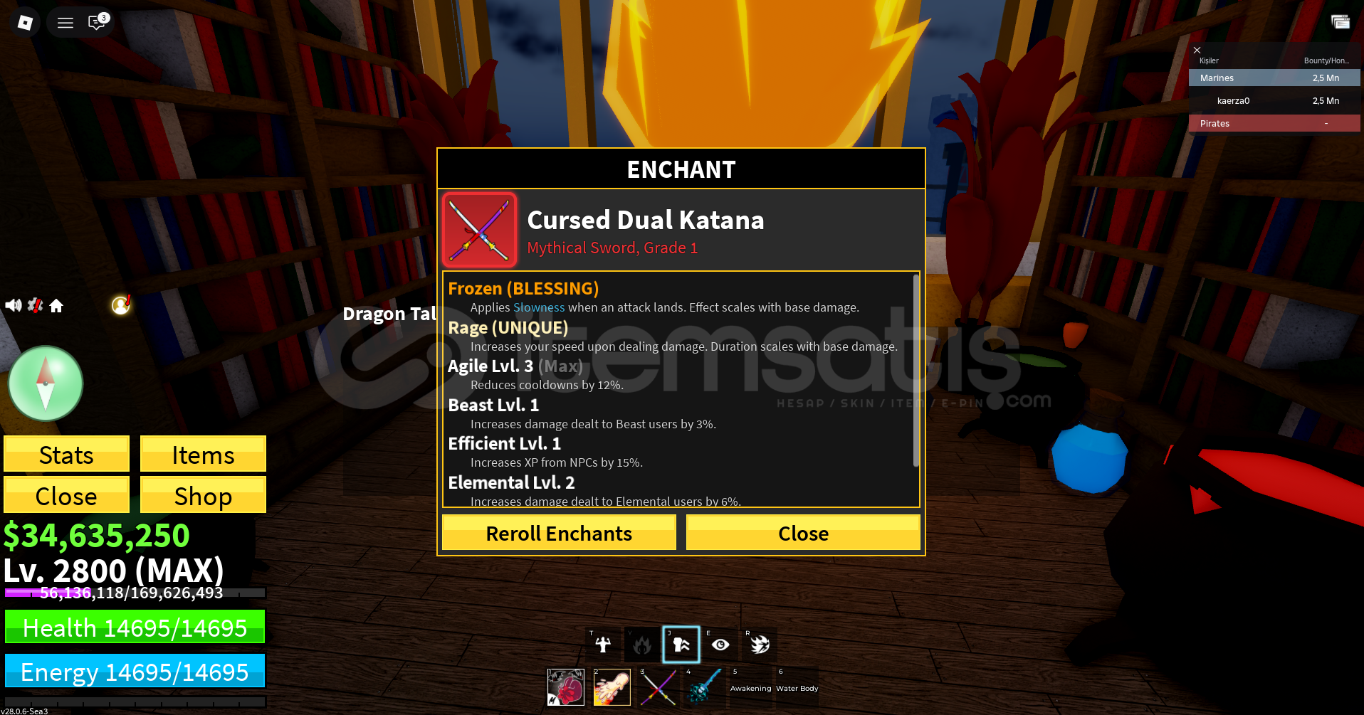 HESAP 2800 MAX LVL'DİRSANGUİNE ART 600LVL'DİR. Diğer Tüm Dövüş Stillerinin Tüm Skilleri Açıktır.FULL GEAR SHARK V4 BULUNMAKTADIR.DOUGH V2 400LVL'DİR. TÜM SKİLLERİ AÇIKTIRCDK +1 YAPILMIŞTIR. FROZEN BLESSİNG ve RAGE ENCHANT BULUNMAKTADIR.CDK 600LVL'DİR. SOUL GUİTAR VE DİĞER TÜM İTEMLERİN TÜM SKİLLERİ AÇIKTIR.34M CASH BULUNMAKTADI...