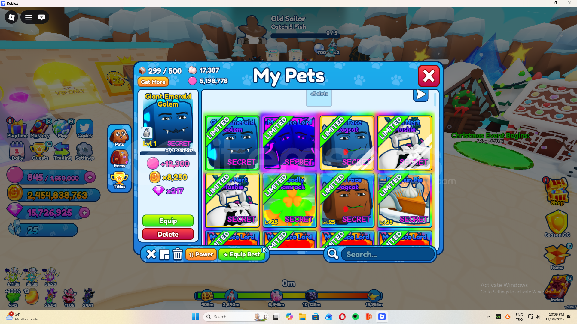 60x Man Face Lord , 9x Maid Nert Plushie , 2x Nert Plushie , 1x Obscure Entity Plushie , 1x Queen Kitty , 4x Sundae Champion , 1x The Overlord , 15x Man Face DogCat , 4x Gian Emerald Golem , 2x Shiny Maid Nert Plushie , 1x OG Godly Shamrock , 1x Pumpkin Pie , 1x Shiny Man Face DogCat , 1x Mythic Man Face Lord , 1x Shiny Giant Emerald Golem