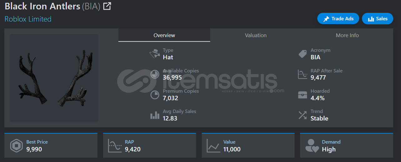 İlanı Aldığınızda Black Iron Antlers Limited Trade Yöntemi İle Teslim EdilirRolimons Sitesine Göre Value Değeri 11000 Robuxtur ve Demandı(Talebi) High Seviyesindedir Yani Kolaylıkla Trade Edebilir Veya SatabilirsinizSize Teslimi Gerçekleştirebilmem İçin Hesabınızda Premium Ve Bir Adet Small Limited(UGC Olmayan 0-200 Robux Arası Herhangi Bir Limited) Bulunmalıdır600+ Başarılı...