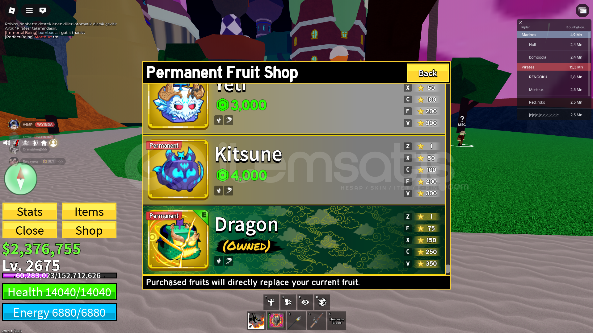 hesapta perm dragon perm dough perm portal perm light var hesap 2560 lvl hesapta spikey trident ve shark anchor felan var