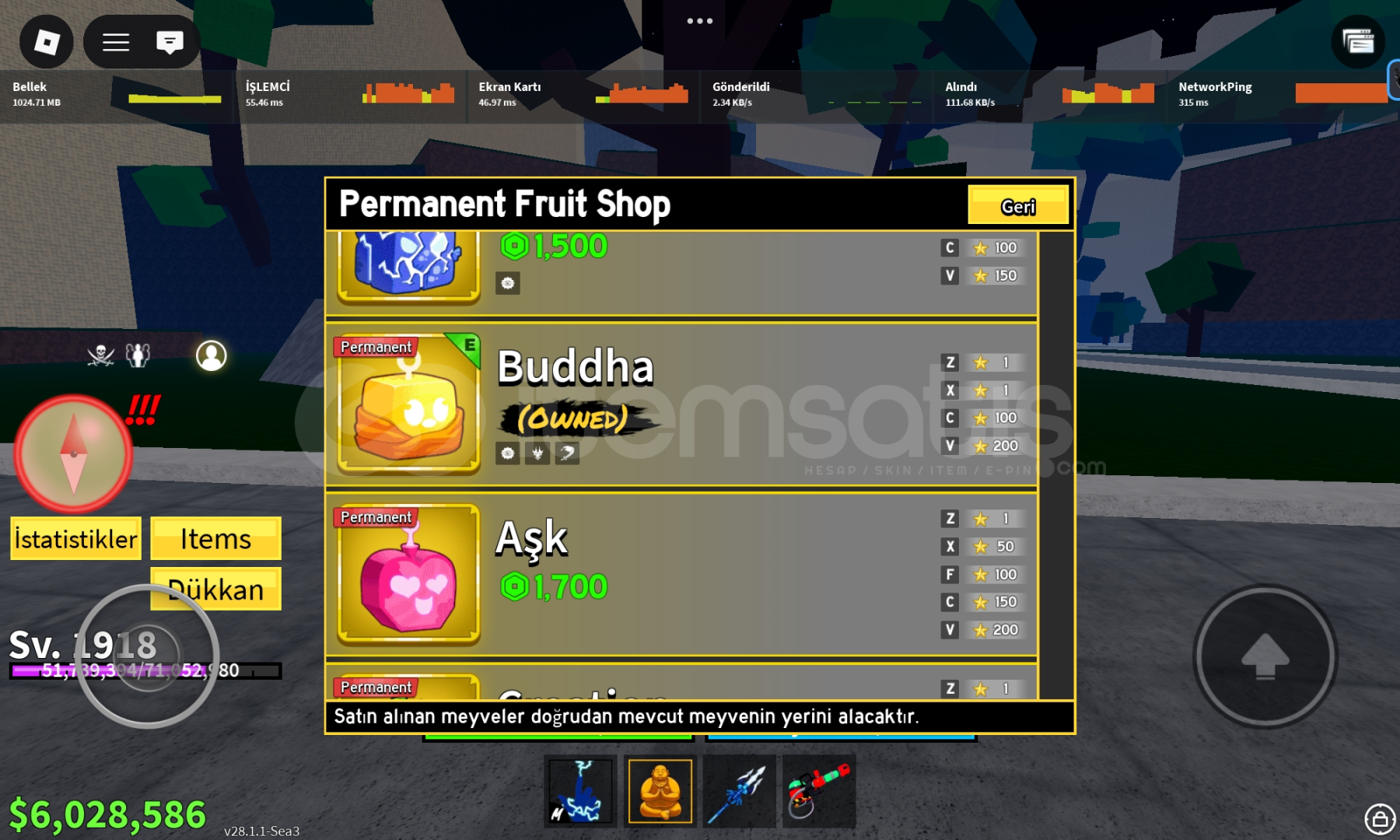 Blox fruit 1900 lvl Perm buddah lı hesap (tek blox fruitte eşyalar yok )(Para lazım o yüzden ana hesabımı satıyorum)