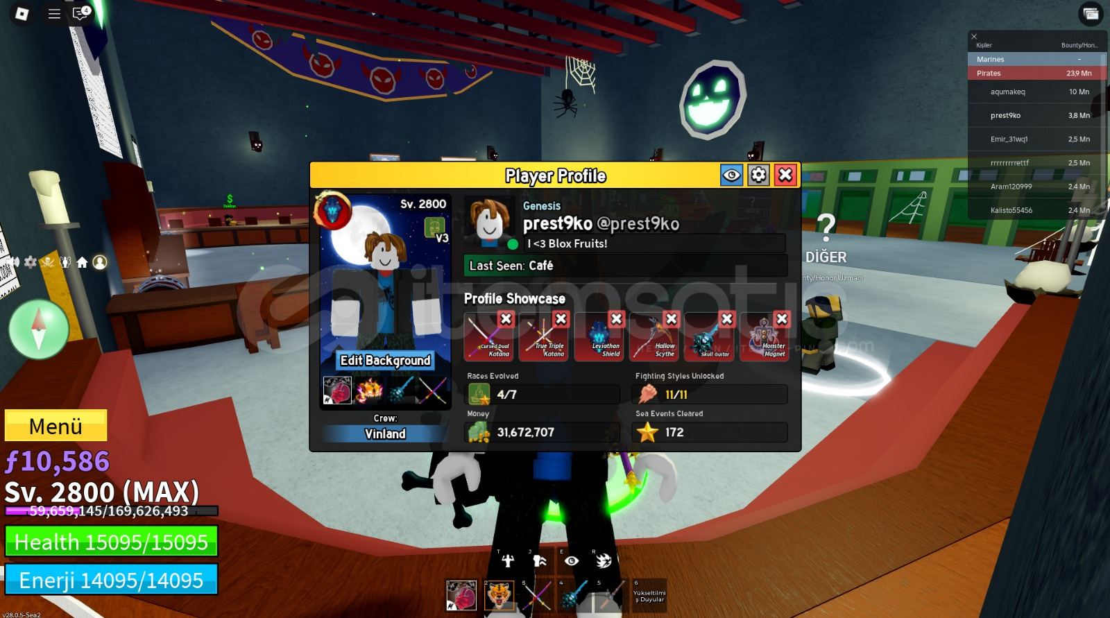 dövüş sitilleri:hepsi vardır : ırklar: cyborg v4 ghoul v3 shark v3 vardır kılıç: CDK, TTK VE HALLOW SCYTHE VARDIR ekipman için ise: leviathan shield vardır tavsiye edilir hesaptaki meyve tıger dır . silah: skull gitar vardır ve hesap max lvl HESAP 3,8M BOUNTY VARDIR