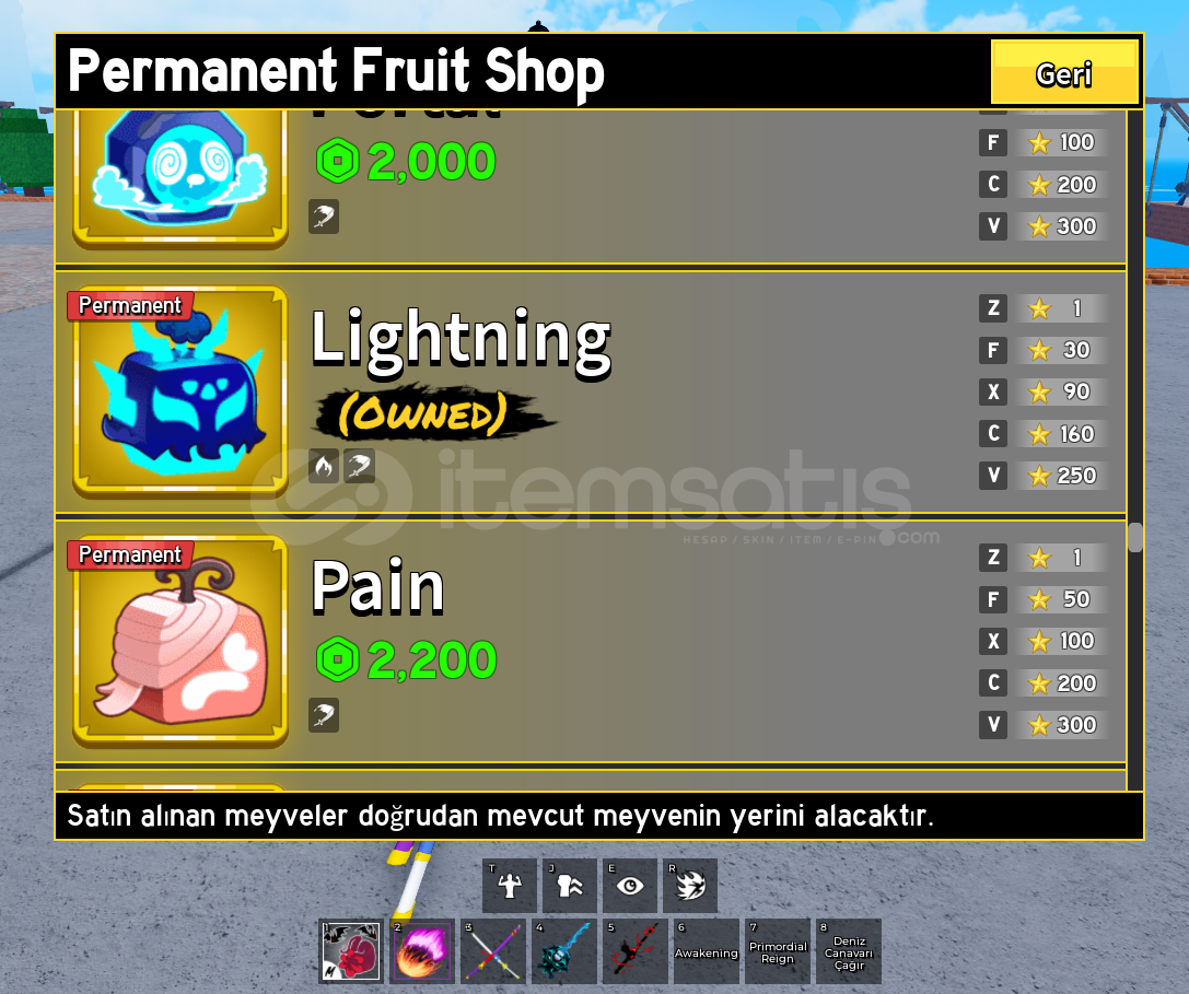 Max lvl olup Hesabın içinde perm dragon perm lightning bulunmaktadır.Ghoul rabbit ve draco full gear v4 dür bütün dövüs stilleri hesabın içinde vardır.Sınırlı sürede gelen eventteki oltalar ve bütün aksesuarları vardır. Cdk,soul guitar,hallow scythe,dragonstorm,dragonheart,spikey trident,shark anchor,magma blaster vb oyundaki en nadir esyalara sahip olup piratede 11m bountysi vardır. İçinde çok değerli olan fruitler bulunmaktadır kitsune,yeti,leopard,gas,green lightning,doung,gravity,portal.İçinde oni aura ve celestial aura vardır.nerdeyse tüm auralara sahiptir. Dragon east ve westdede tüm auralar açıktır.Fiyatta cüzzi bir indirim yapılabir hesap hakkında konusmak isteyen özelden yazabilir.tesekkürler