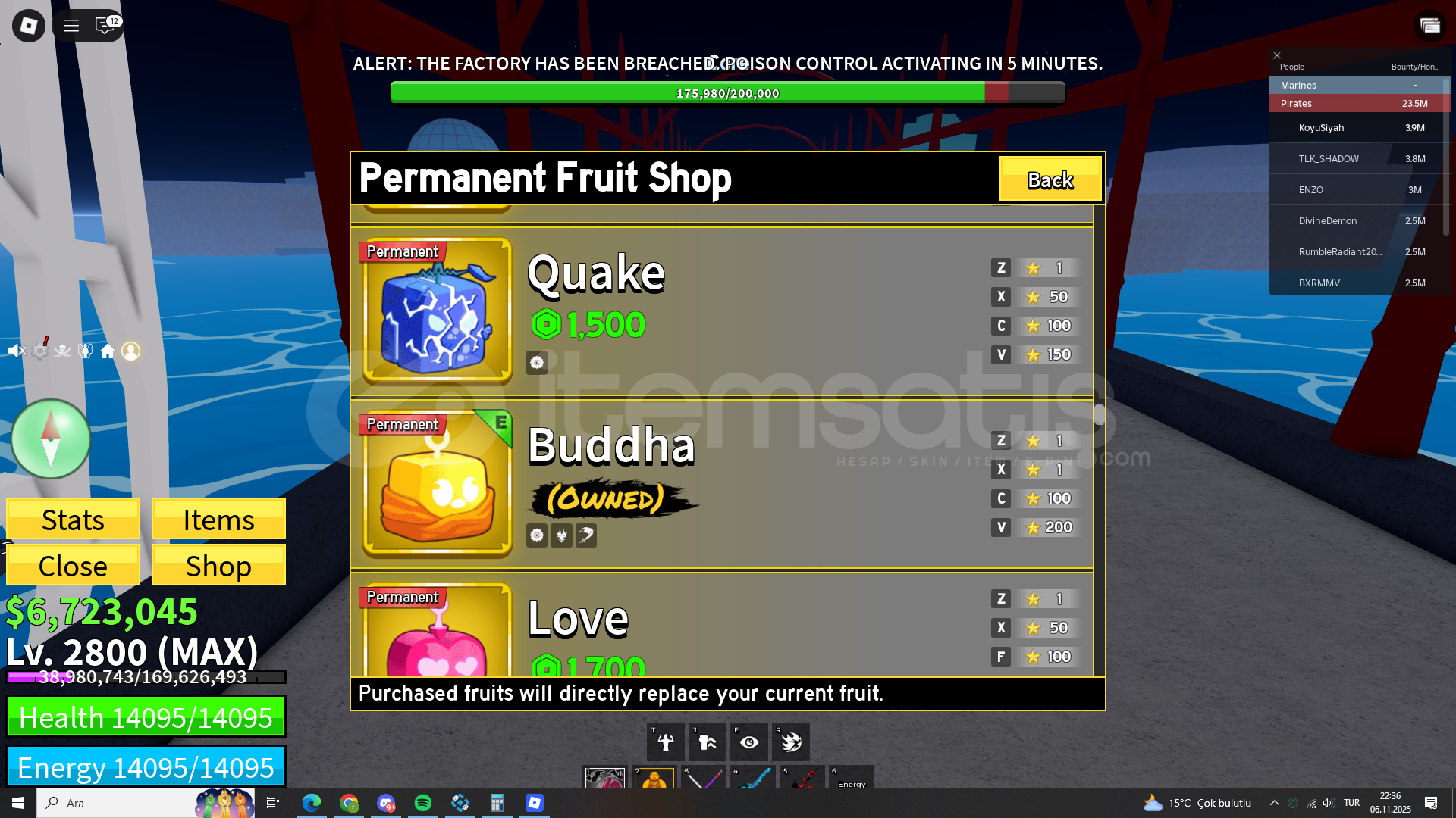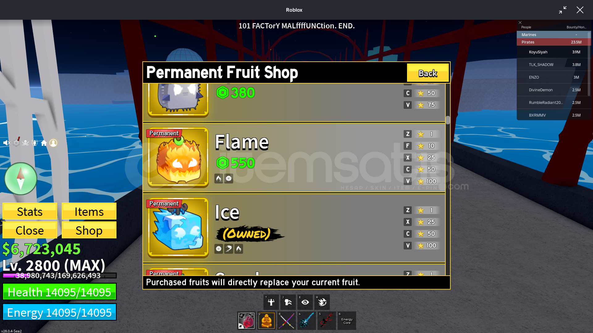 Hesap MAX Leveldir6M Parası425 Fragmenti vardır-----------------------Hesapta Permanent Buddha ve İce VardırCDK (516 Mastery)Cyborg V3Skull GuitarSnow White Hakisi Vardır-----------------------Pirate 3.9M BountyMarine 2.5M Bounty