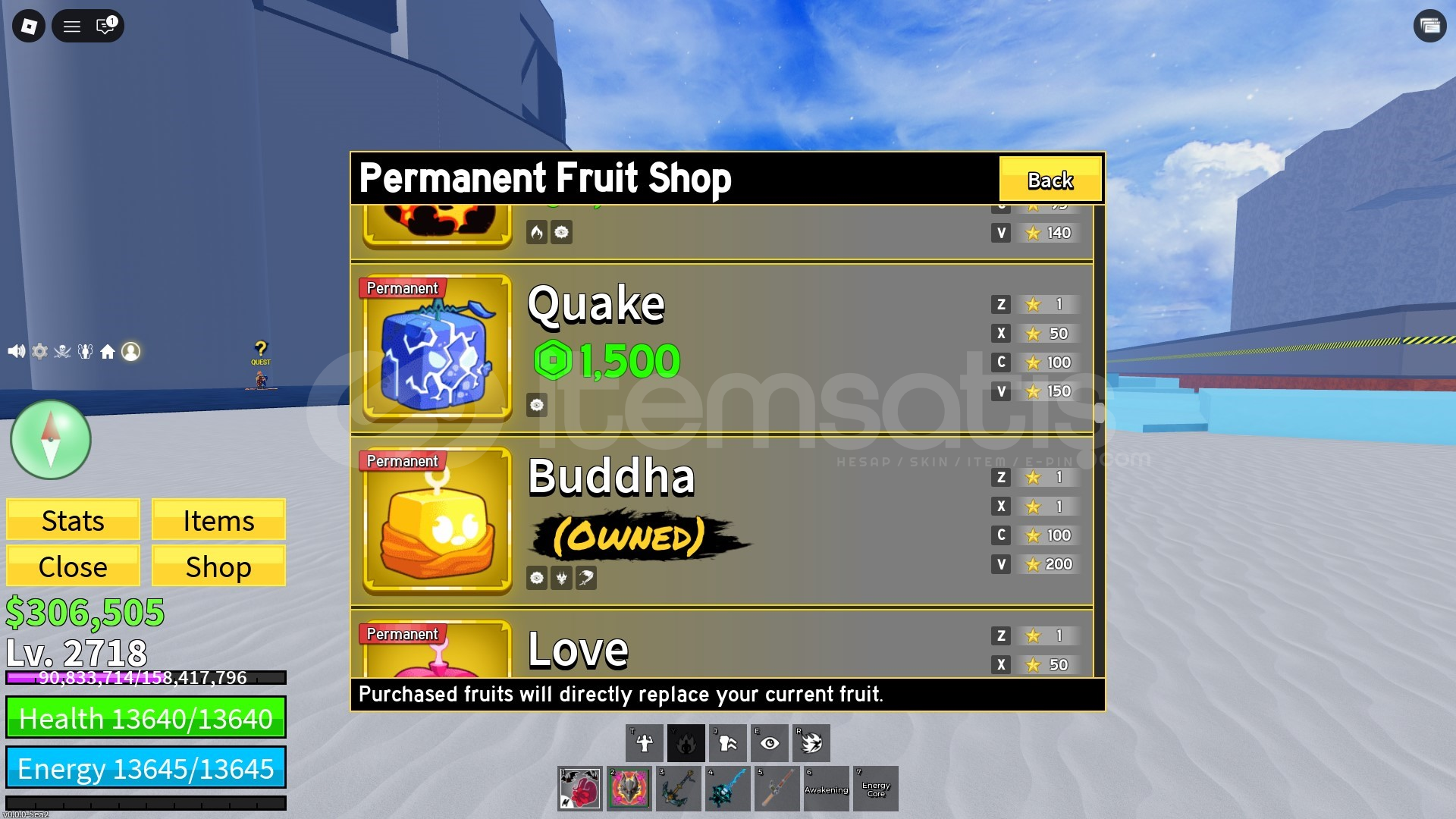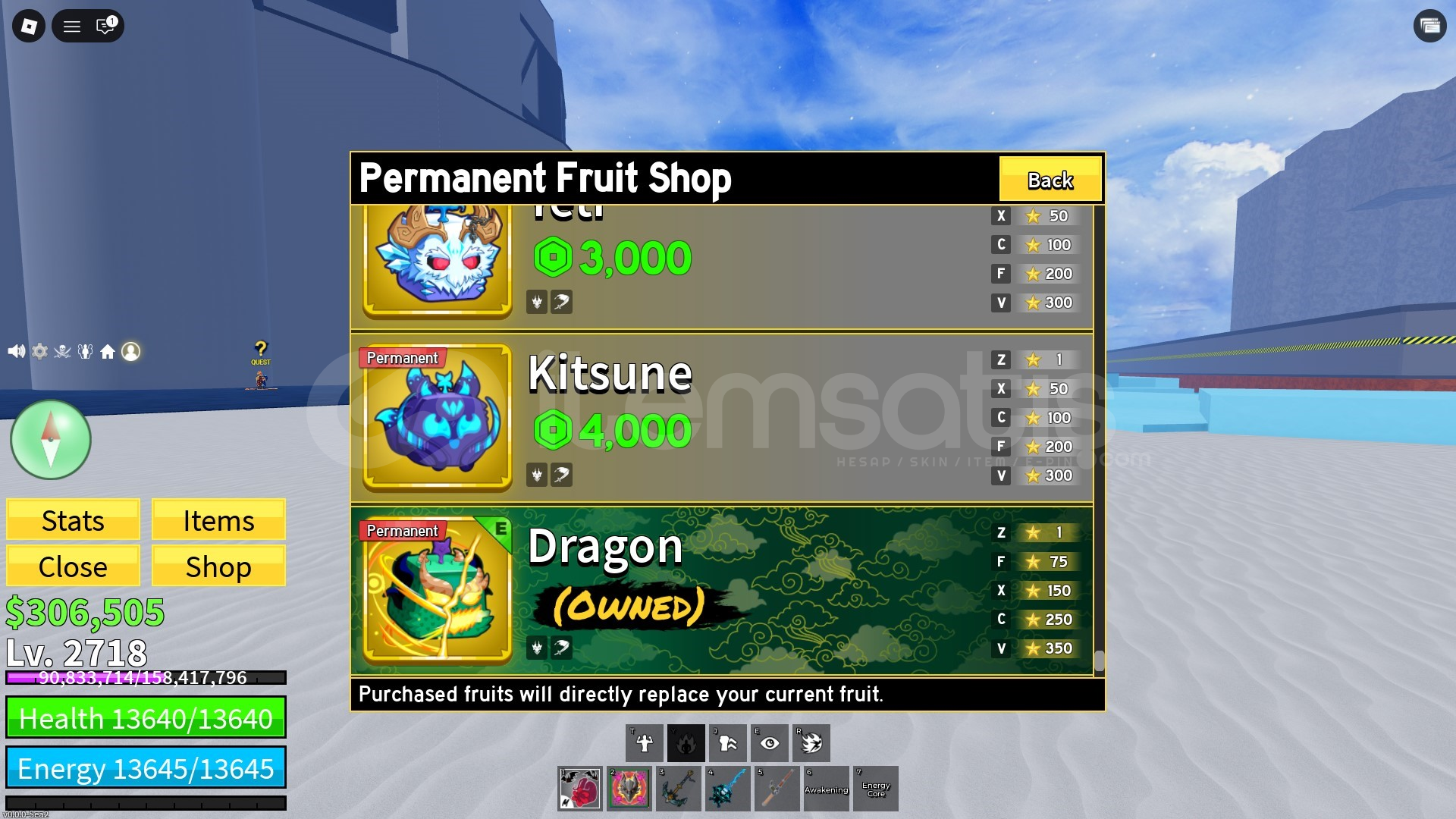 Permler :Dragon , Gas , Dough, Portal, Buddha ve rocket dirGamepasslar :Dark Blade, 2X mastery 2x money toplam 3 storage ve fast boats dırHesabın içindekiler : Bütün Dövüş Stilleri (sanguine dahil)Cyborg V4 maxTTK dışında çoğu kılıç Shark anchor bile varSkull Guitar da varHesabın içinde venom meyvesi de hediyedirYT Videosu link bu : https://www.youtube.com/watch?v=SRJKKVnl_tE