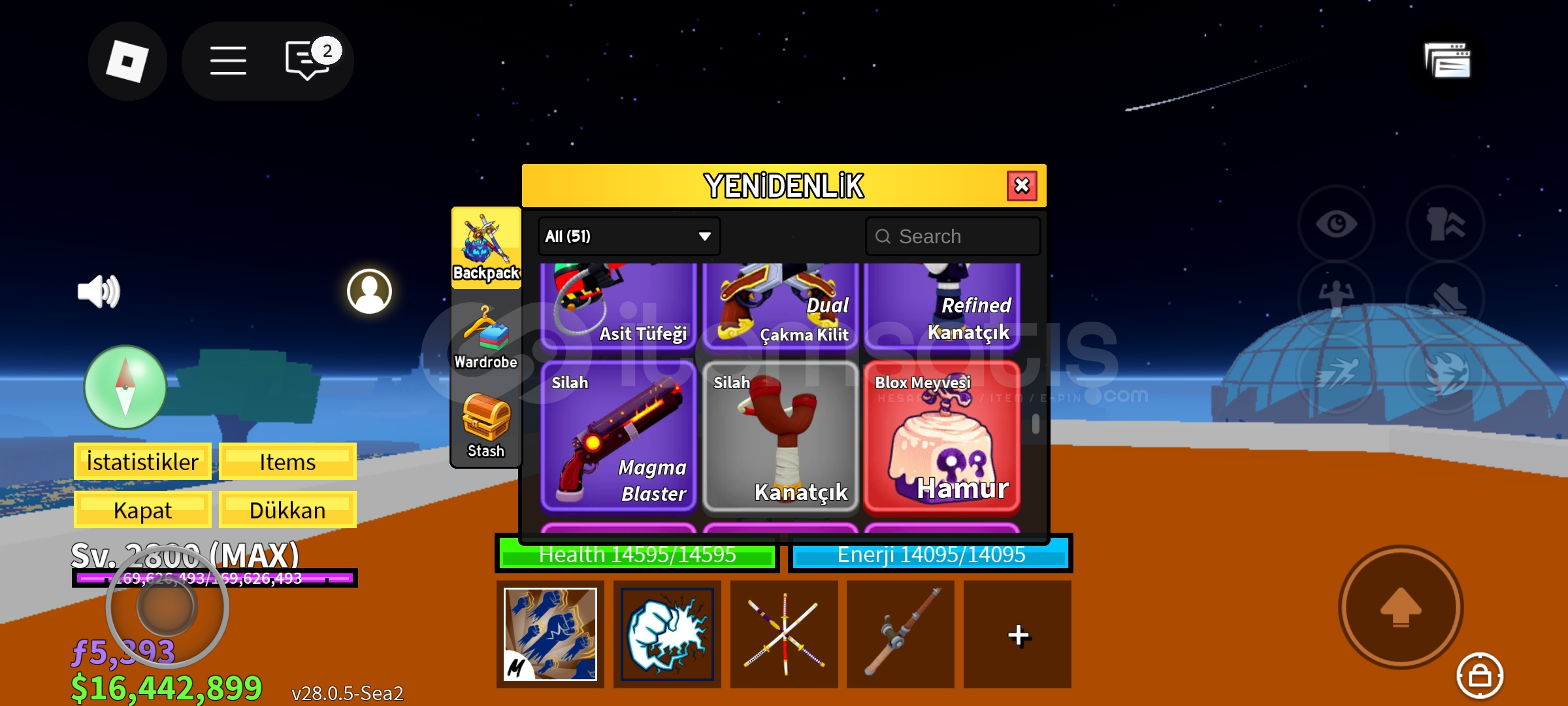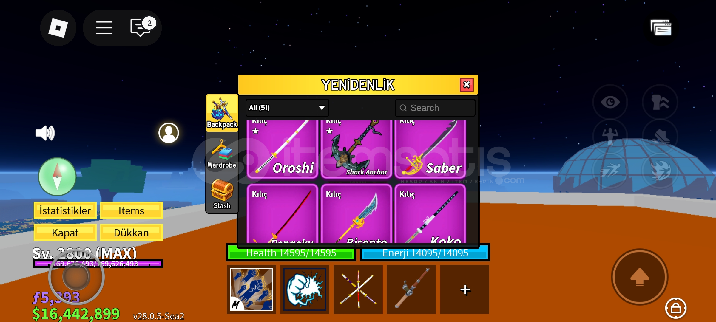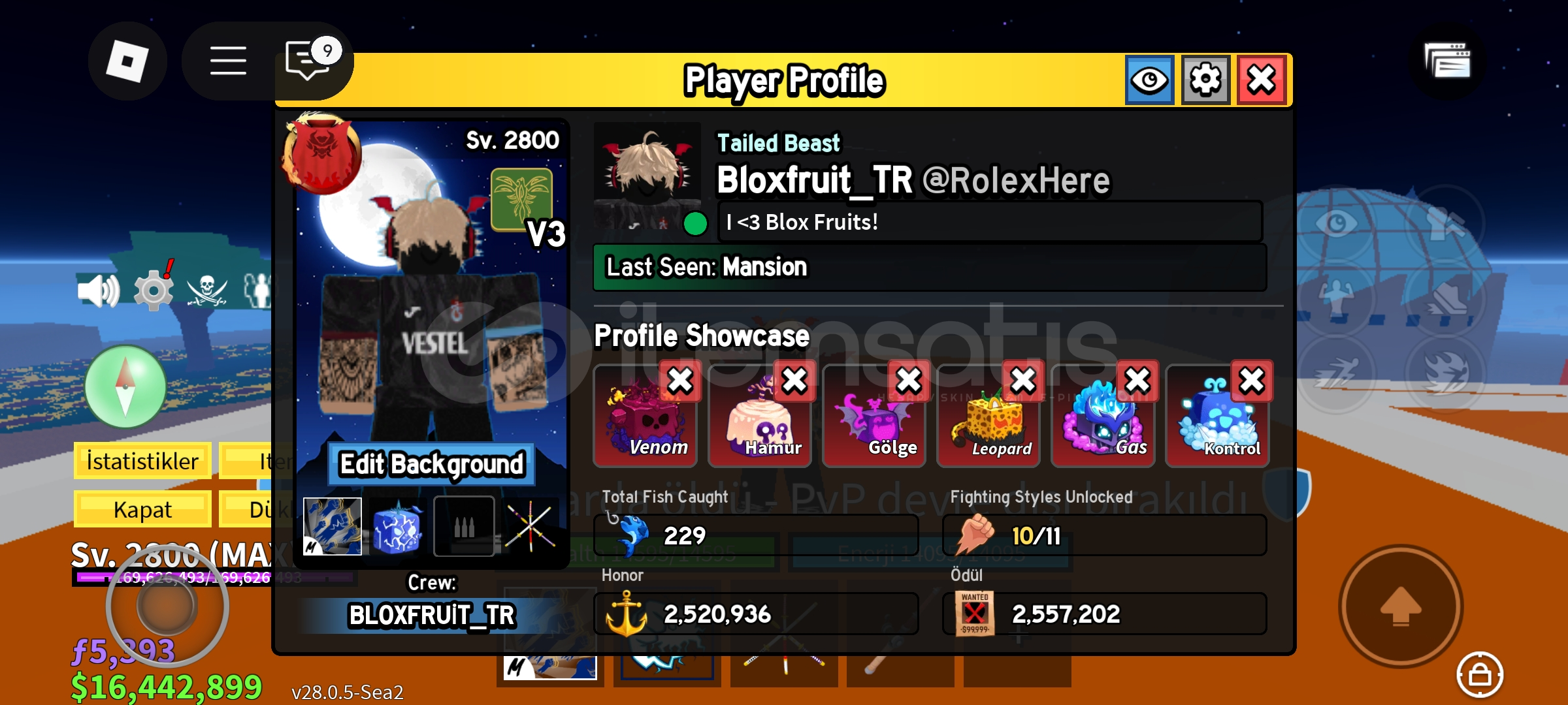 BLOX FRUITS MAX LEVEL PVP HAZIR FULL HESAP ⭐(MAX Seviye, Dough V2 Tamamlanmış, Nadir Kılıçlar + Legendary Scroll Basılı, Tailed/Angel V3)💎 1. HESAP VE KARAKTER BİLGİLERİSeviye (Level): MAX (2800)Para (Beli): 16,442,899+Ödül / Onur (Bounty/Honor): 2,557,202 / 2,520,936Irklar (Race): Tailed Beast V3 (Kuyruklu Canavar) ve Angel V3 (Melek)Son Görülme: MansionKlan (Crew): BLOXFRUIT_TRToplam Yakalanan Balık: 22...