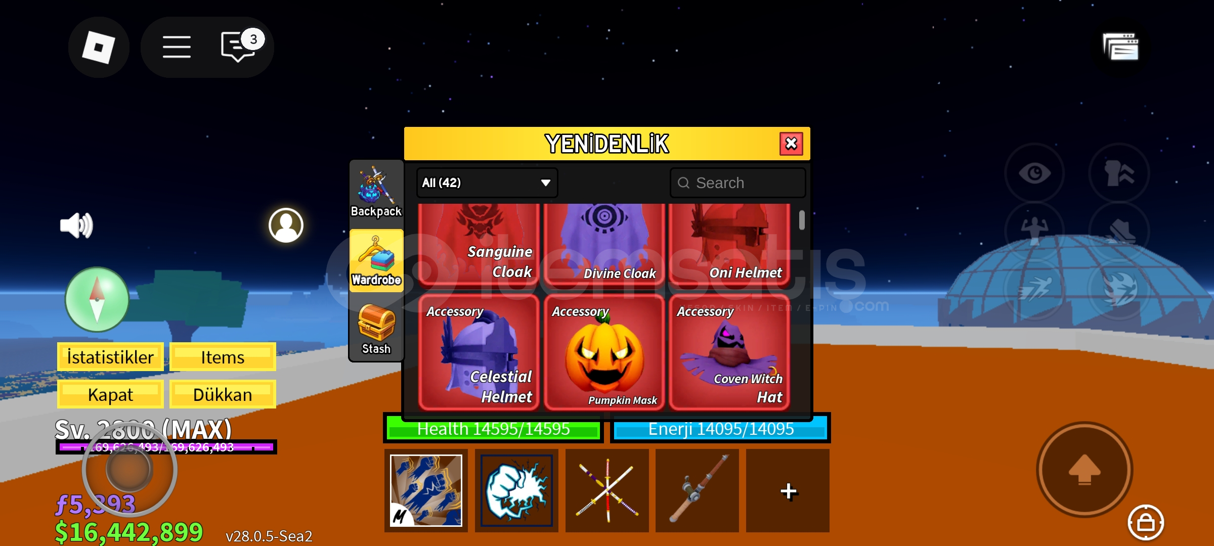 PVP/Nadir Aksesuarlar: Sanguine Cloak, Divine Cloak, Celestial Helmet, Oni Helmet, Pumpkin Mask, Coven Witch Hat, Shark Tooth Necklace, Hunter Cape, Terror Jaw, Feathered Visage, Warrior Helmet, Golden Sunhat, Soluk Eşarp (Pale Scarf).