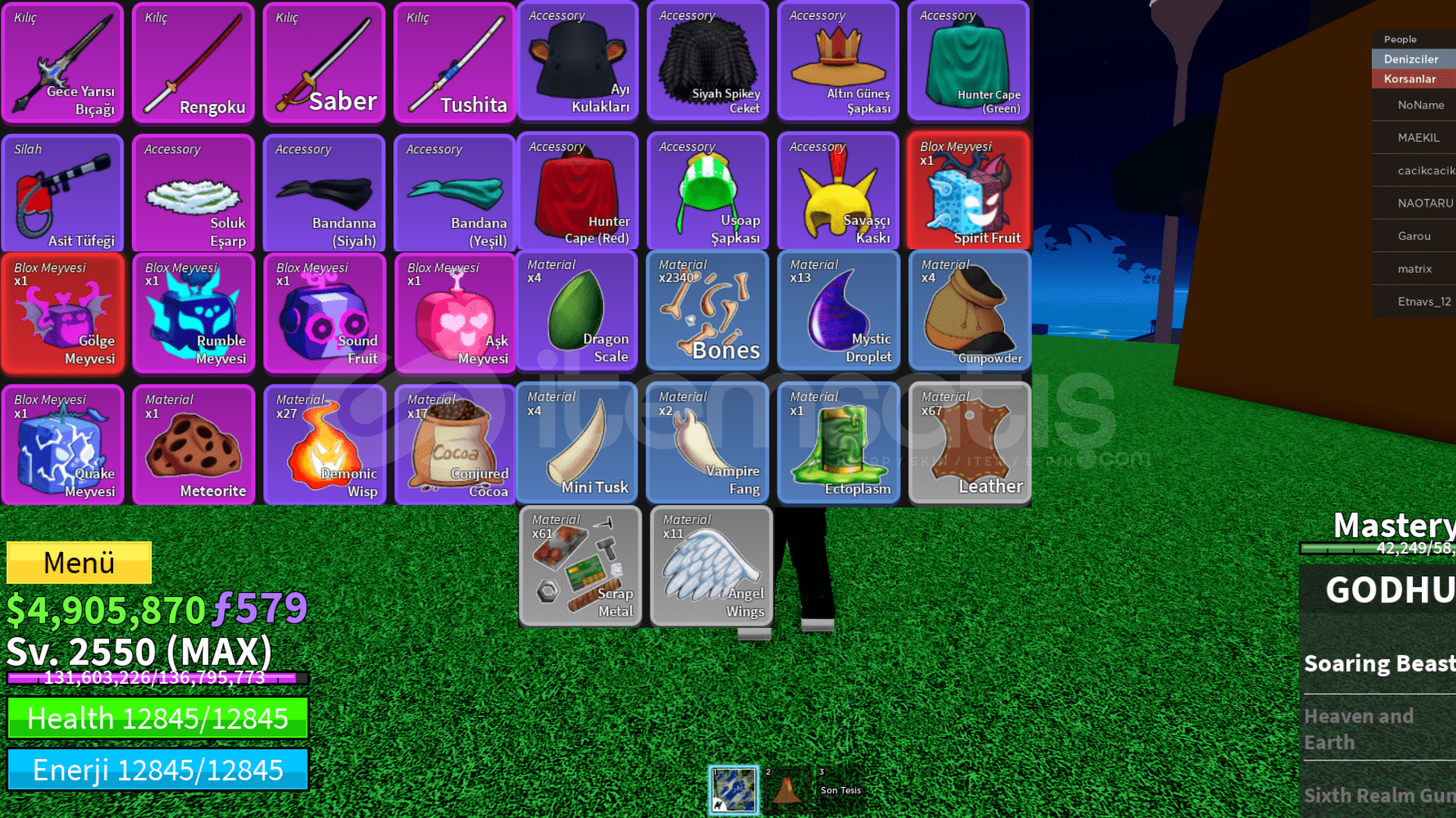 2550 MAX LEVEL HESAPDÖVÜŞ STİLLERİ > GÖRSELDE MEVCUTTURFRUİT: GÖRSELDEKİ GİBİDİRBELİ GÖRSELDEKİ GİBİDİRFRAGMENT GÖRSELDEKİ GİBİDİRAKSESUAR KILIÇ VE SİLAH GÖRSELDEKİ GİBİDİRHESAP BİLGİLERİ:DAHA ÖNCESİNDE HERHANGİ BİR EMAİL VE TELEFON NUMARASI KAYIT EDİLMEMİŞTİRALDIKTAN SONRA HESABIN ...